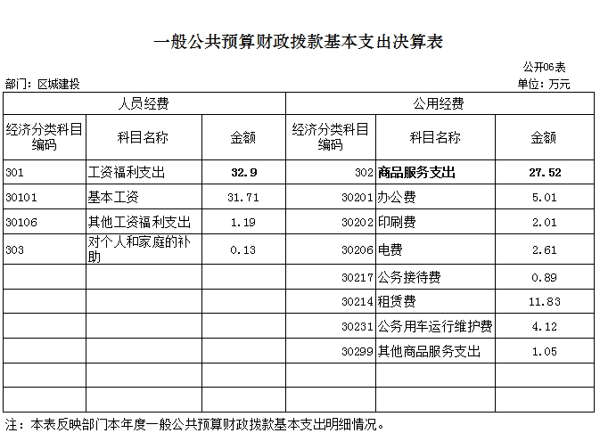 (二)公用经费27.52万元。主要包括:办公费、水费、电费、邮电费、物业管理费、差旅费、维修(护)费、租赁费、会议费、培训费、公务接待费、劳务费、委托业务费、工会经费、福利费、公务用车运行维护费、其他交通费用、其他商品和服务支出、办公设备购置。
