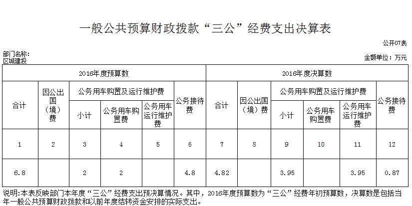 岳阳市岳阳楼区城市建设投资管理中心2016年度一般公共预算拨款安排的“三公”经费决算支出中,公务用车购置及运行费支出3.95万元,占“三公”经费的82%;公务接待费支出0.87万元,占“三公”经费的18%。具体情况如下:
