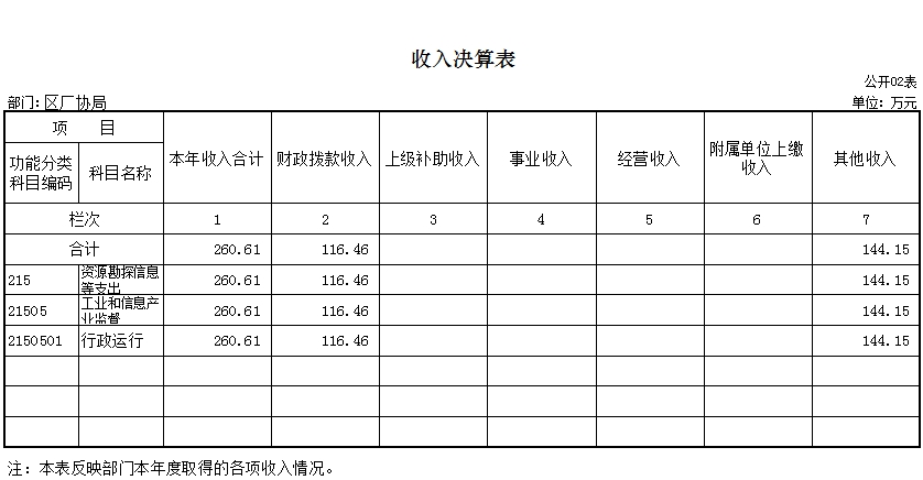 岳阳楼区厂地协作局收入合计260.01万元,其中:财政拨款收入116.46万元,非税收入返还144.15万元