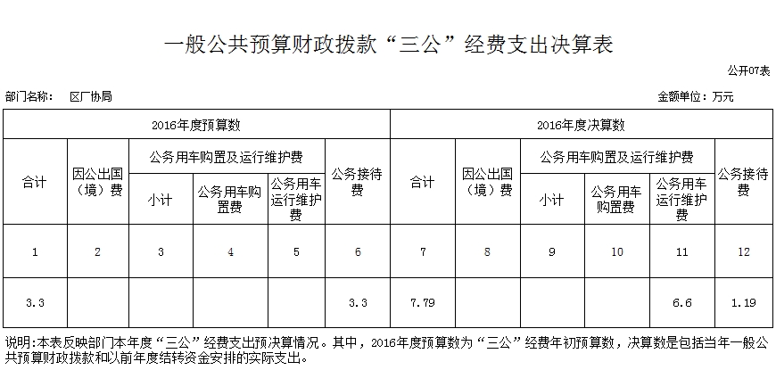 厂协局2016年度一般公共预算拨款安排的“三公”经费决算支出中,公务用车购置及运行费支出6.6万元;公务接待费支出1.19万元。具体情况如下: