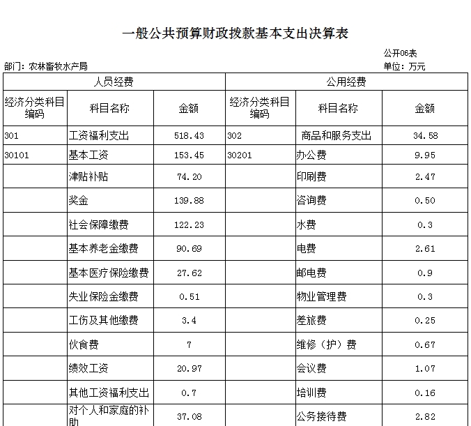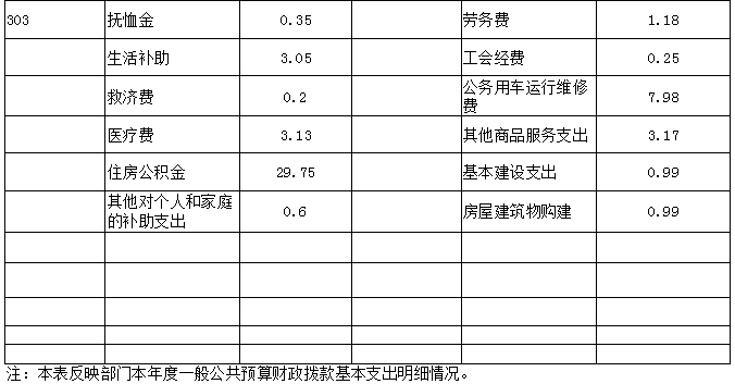 工资福利支出518.43万元,其中基本工资153.45万元、津补贴74.20万元、奖金139.88万元、社会保障122.23万元、基本养老金90.69万元、基本医疗保险27.62万元、失业保险金0.51万元、工伤及其他缴费3.4万元、伙食费7.0万元、绩效工资20.97万元、其他工资福利支出0.7万元。商品和服务支出34.58万元,其中办公费9.95万元、印刷费2.47万元、咨询费0.5万元、水费0.3万元、电费2.61万元、邮电费0.9万元、物业管理0.3万元、差旅费0.25万元、维修费0.67万元、会议费1.07万元、培训费0.16万元、劳务费1.18万元、工会经费0.25万元、其他商品服务支出3.17万元、公务接待2.82万元、公务用车运行维护7.98万元、基本建设支出0.99万元。对个人和家庭的补助37.08万元,其中抚恤金0.35万元、生活补助3.05万元、救济费0.2万元、医疗费3.13万元、住房公积29.75万元、其他对个人和家庭的补助支出0.6万元。