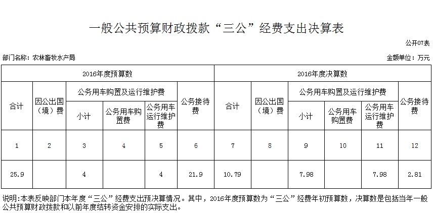 (一)、2016年度。我单位年初结转和结余41.87万元,本年总收入579.02万元,其中财政拨款收入579.02万元;本年总支出591.09万元。年末结转和结余29.8万元。2016年三公经费预算25.9万元,实际支出10.79万元,其中:公务接待2.81万元、公车运行7.98万元,三公经费实际使用数比预算数少支出15.11万元。