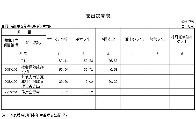 2)支出情况:2016年总支出87.11万元,基本支出60.23万元;项目支出26.88万元。主要用于办案专项支出,包括案件调查、勘验、差旅,证人误工补助,仲裁文书送达。装订等;宣传费支出用于宣传场地、宣传展板横幅制作及印刷资料;专职仲裁员补助支出用于专职仲裁员办案期间的补贴;兼职仲裁员补助支出用于兼职仲裁员办理劳动纠纷仲裁案件期间的补贴。