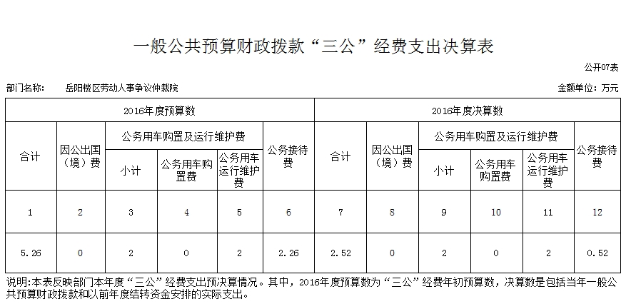 1、2016年度岳阳楼区劳动人事争议仲裁院无因公出国(境)经费支出。