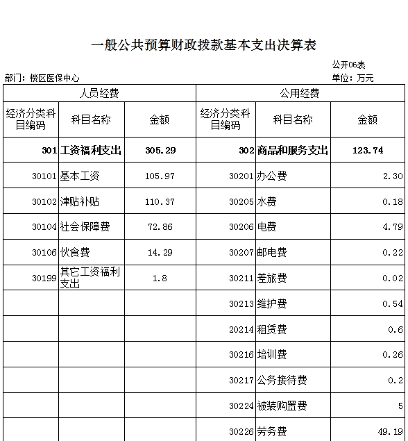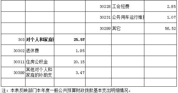 工资福利支出305.29万元。其中:基本工资105.97万元、津补贴110.37万元、社会保障缴费77.86万元、伙食费14.29万元、其他工资福利支出1.8万元。商品和服务支出123.74万元。其中:办公费2.3万元、水费0.18万元、电费4.79万元、邮电费0.22万元、差旅费0.02万元、维修费0.54万元、租赁费0.6万元、培训费0.26万元、公务接待费0.2万元、被装购置费5万元、劳务费49.19万元、工会经费2.85万元、公务用车维护1.07万元、其他商品和服务支出56.52万元。 对个人和家庭的补助25.57万元。其中:退休费1.95万元,住房公积金20.15万元,其它对个人和家庭的补助支出3.47万元