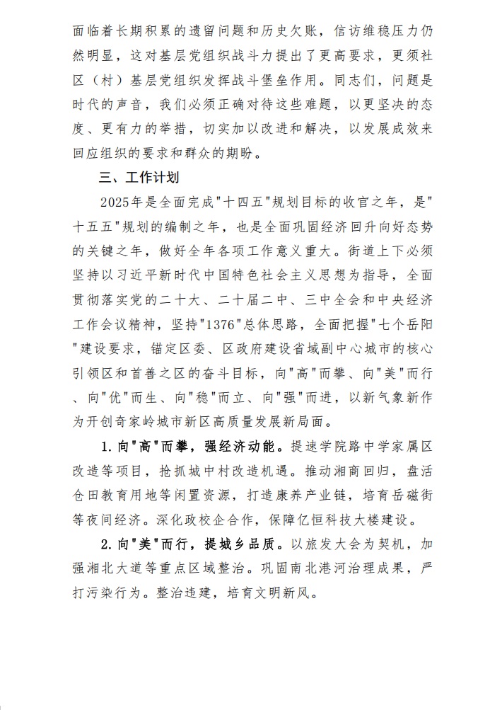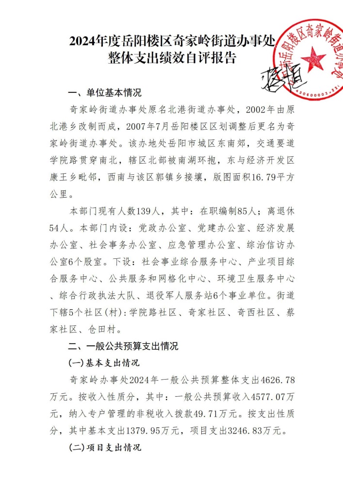 2024年度岳阳楼区奇家岭街道办事处整体支出绩效自评报告