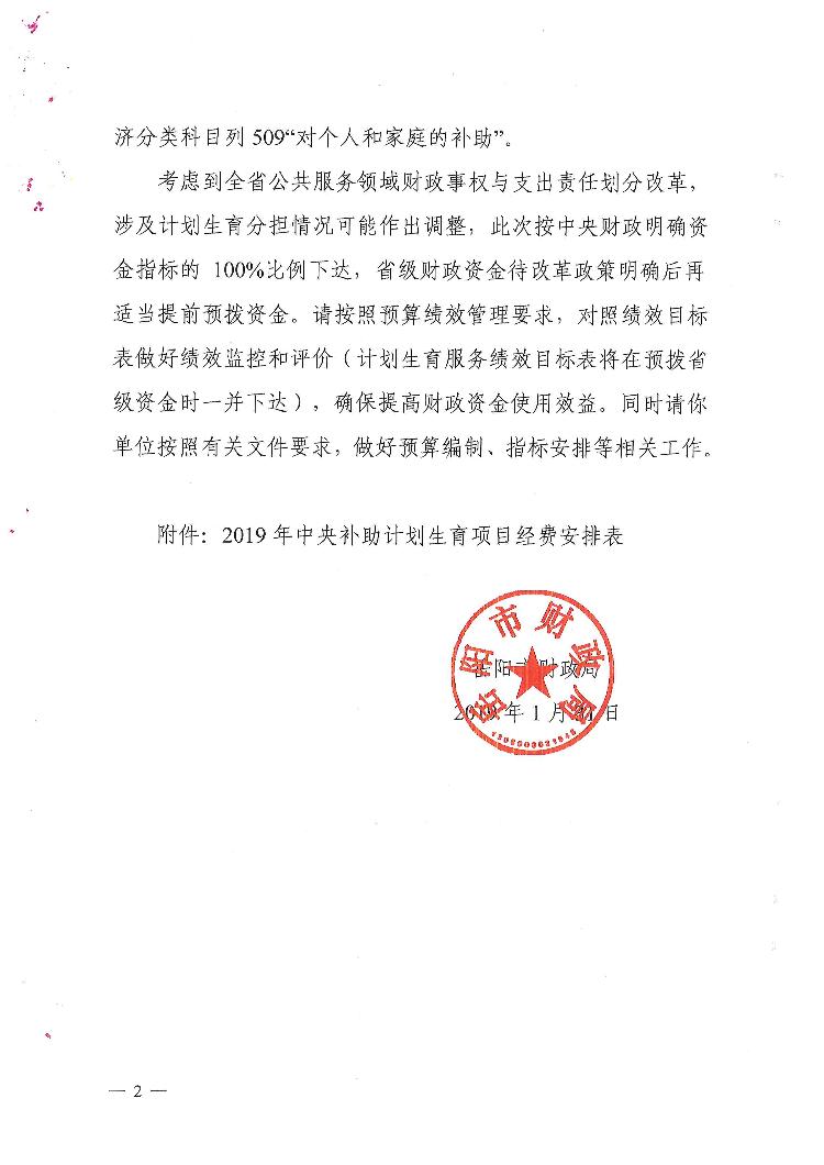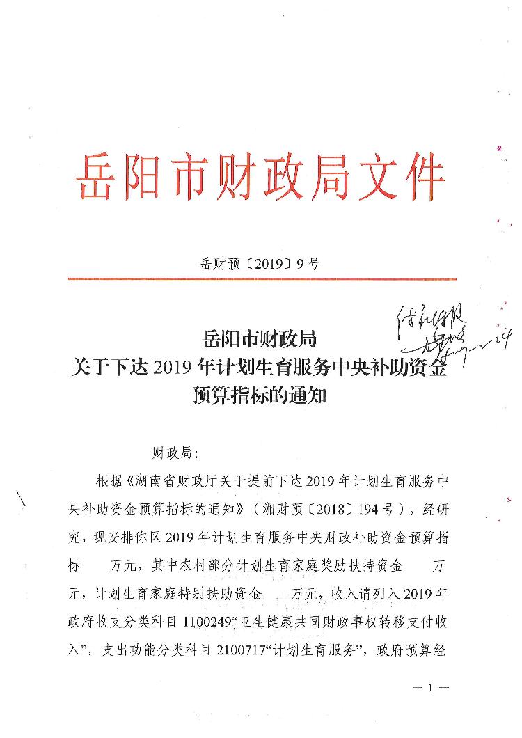 预【2019】9号下达计划生育服务中央补助资金预算指标的通知