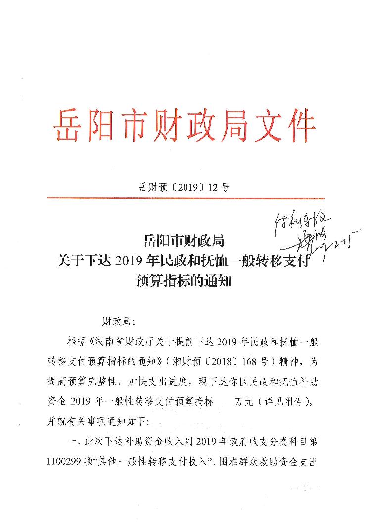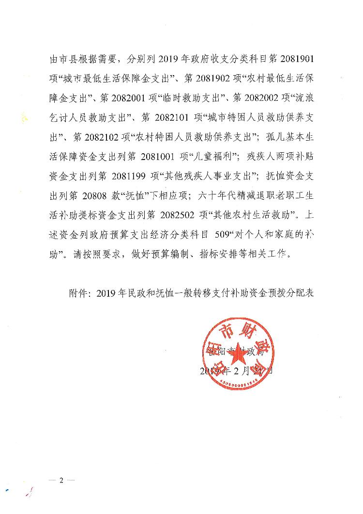 预【2019】12号下达民政和抚恤一般转移支付预算指标的通知