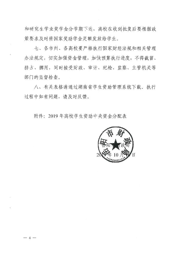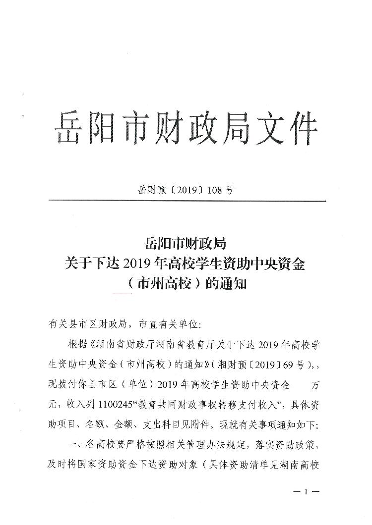预【2019】108号下达2019年高校学生资助中央资金(市州高校)的通知