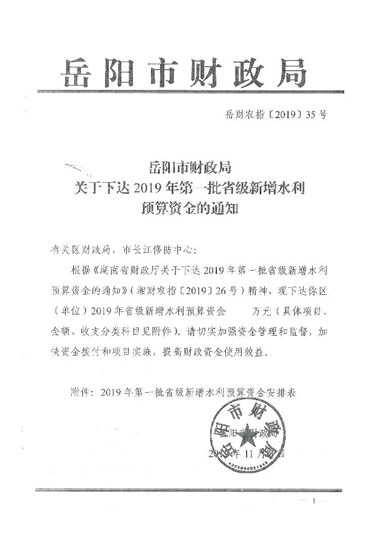 农指【2019】35号下达第一批省级新增水利预算资金的通知