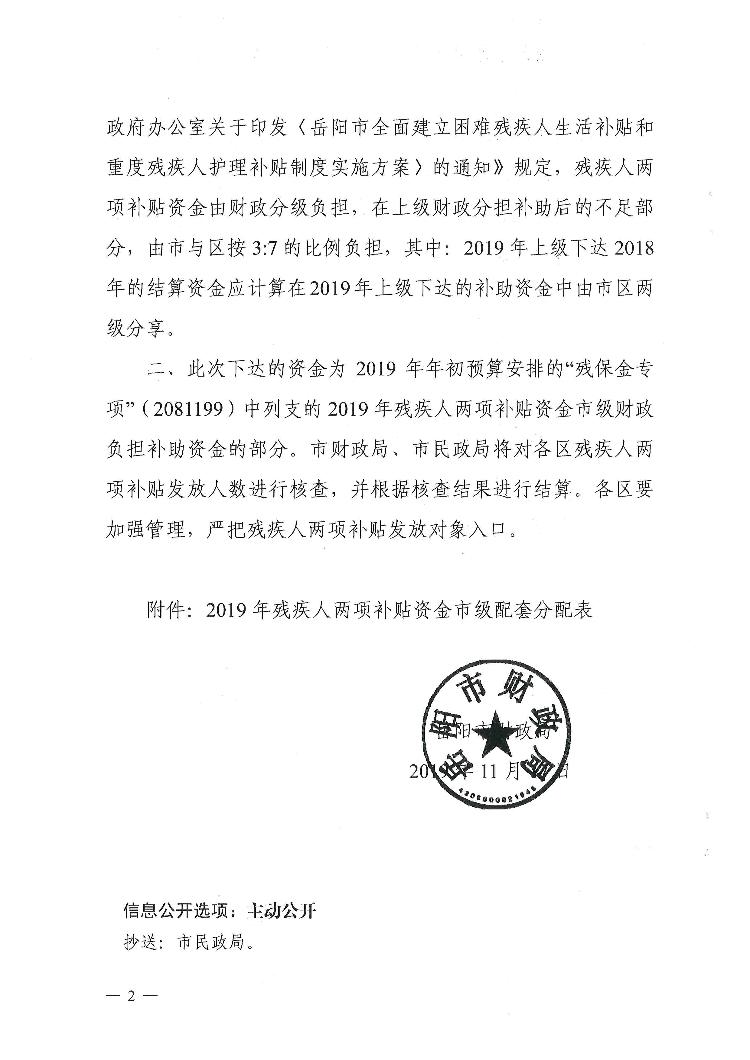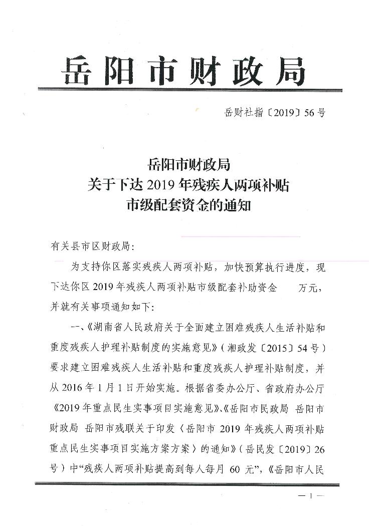 社指【2019】56号下达残疾人两项补助市级配套资金的通知