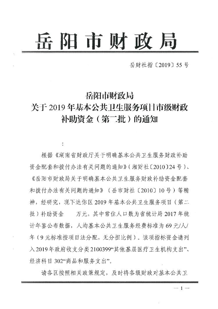 社指【2019】55号关于2019年基本公共卫生服务项目市级财政补助资金(第二批)的通知