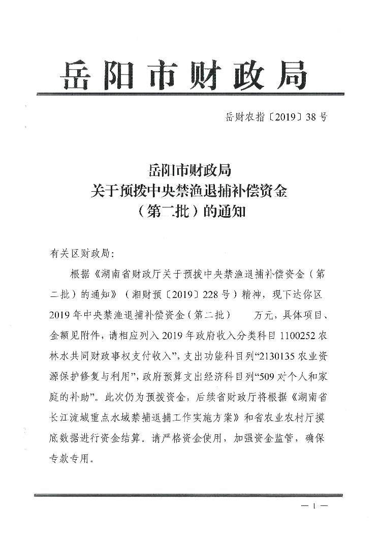 农指【2019】38号预拨中央禁渔退捕补偿资金(第二批)的通知