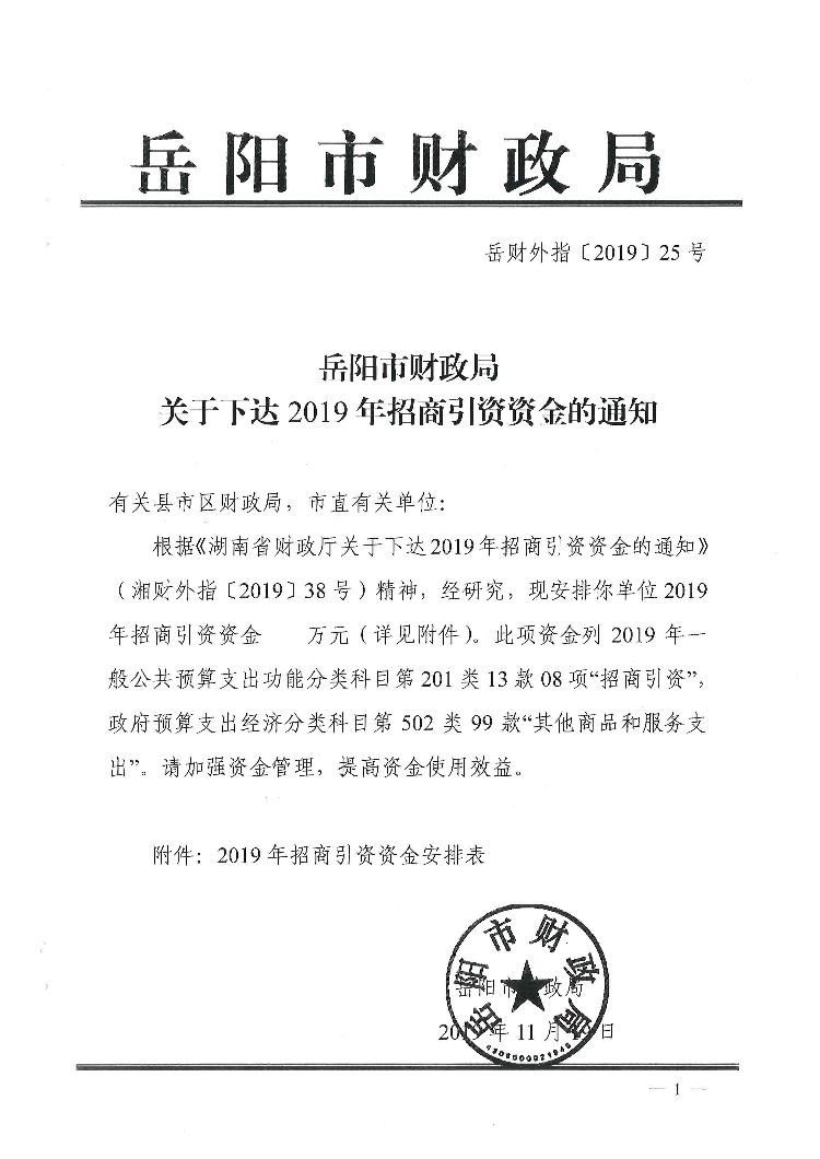 外指【2019】25号下达2019年招商引资资金的通知