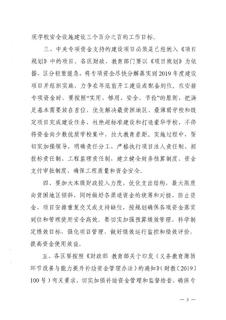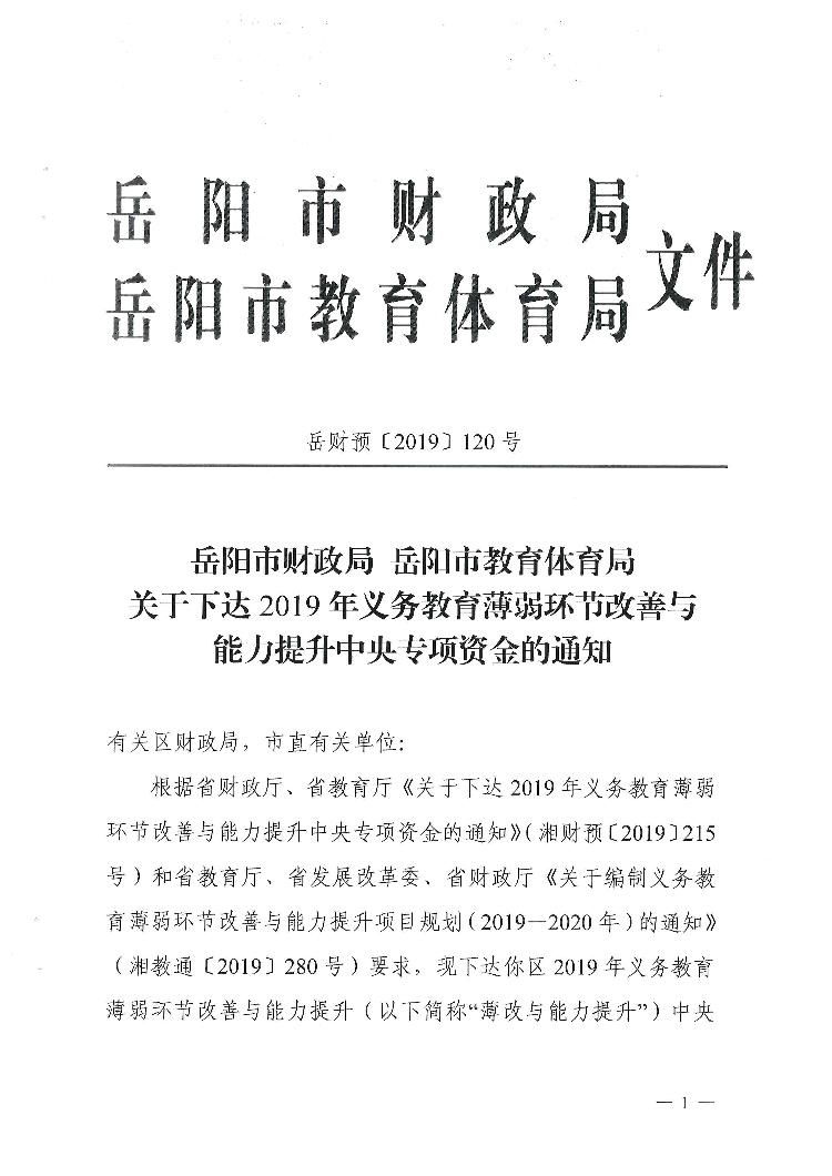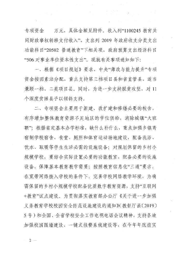 预【2019】120号下达2019年义务教育薄弱环节改善与能力提升中央专项资金的通知
