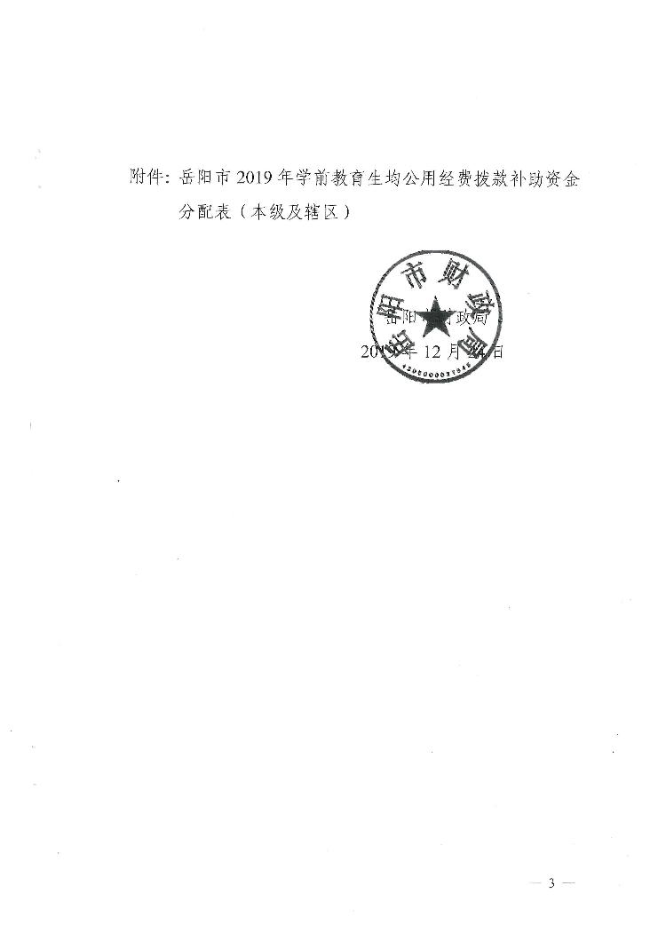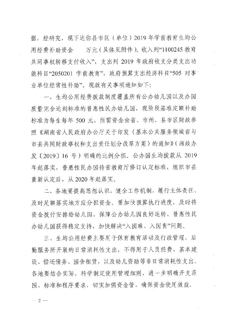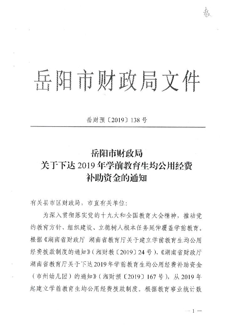 预【2019】138号下达学前教育生均公用经费补助资金的通知