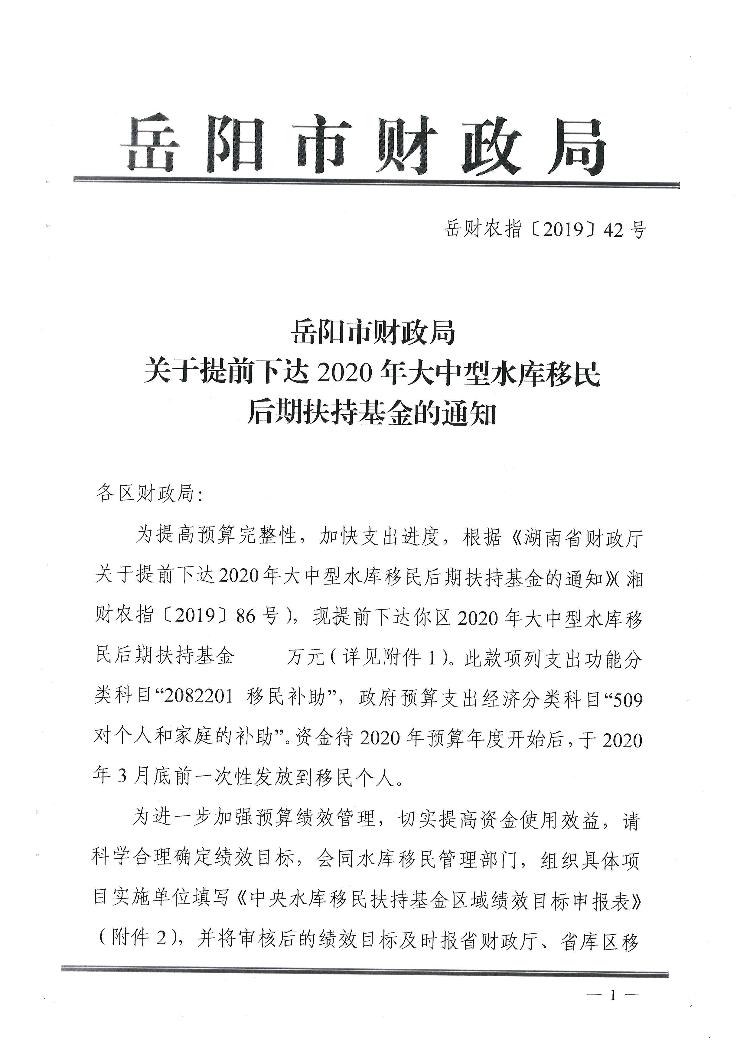 农指【2019】42号提前下达2020年大中型水库移民后期扶持基金的通知