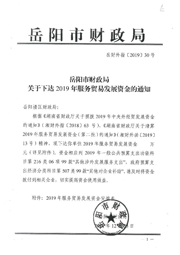 外指【2019】30号下达服务贸易发展资金的通知