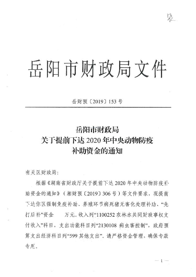 预【2019】153号提前下达2020年中央动物防疫补助资金的通知