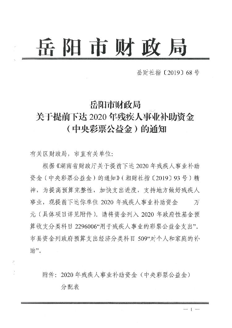 社指【2019】68号提前下达2020年残疾人事业补助资金(中央彩票公益金)的通知