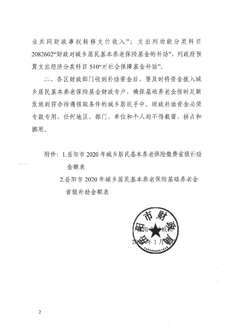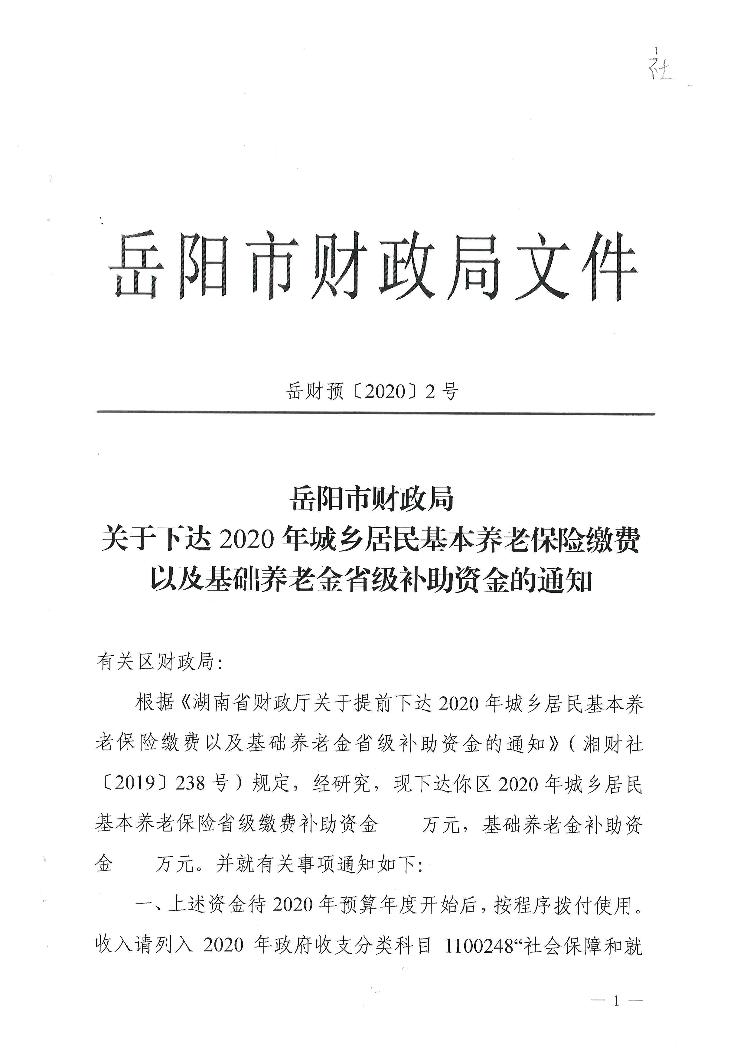 预【2020】2号下达2020年城乡居民基本养老保险缴费以及基础养老金省级补助资金的通知