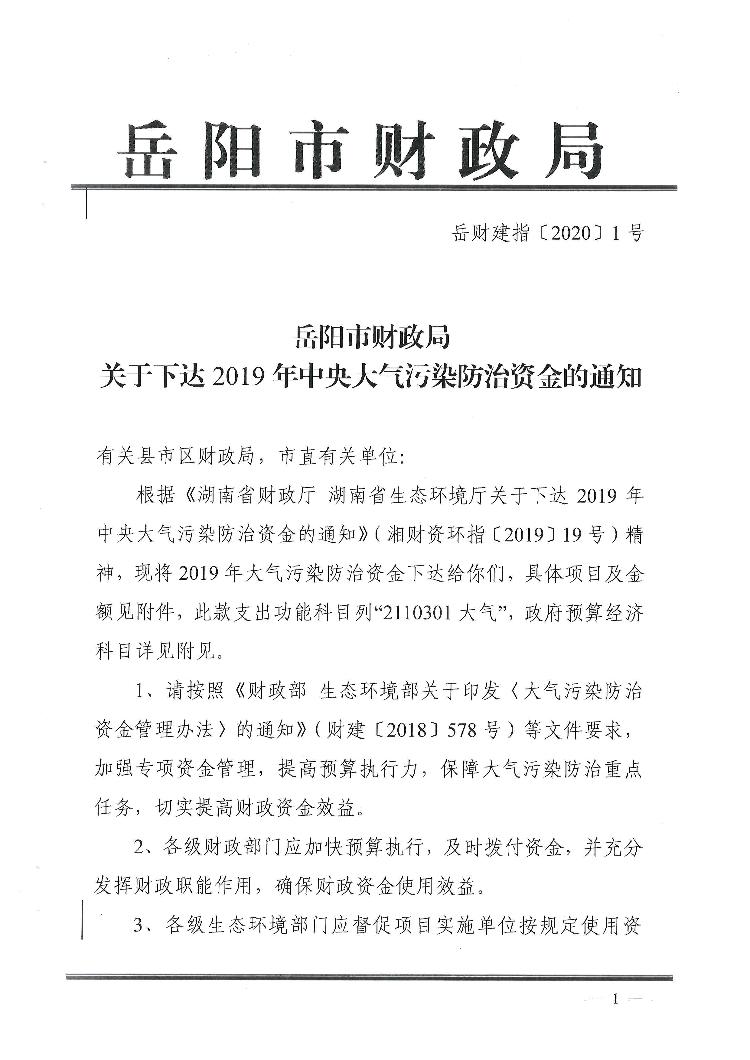 岳财建指【2020】1号2019年中央大气污染防治资金的通知