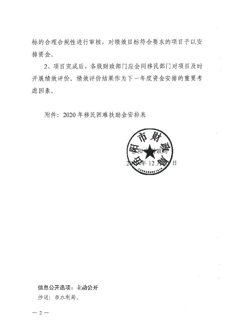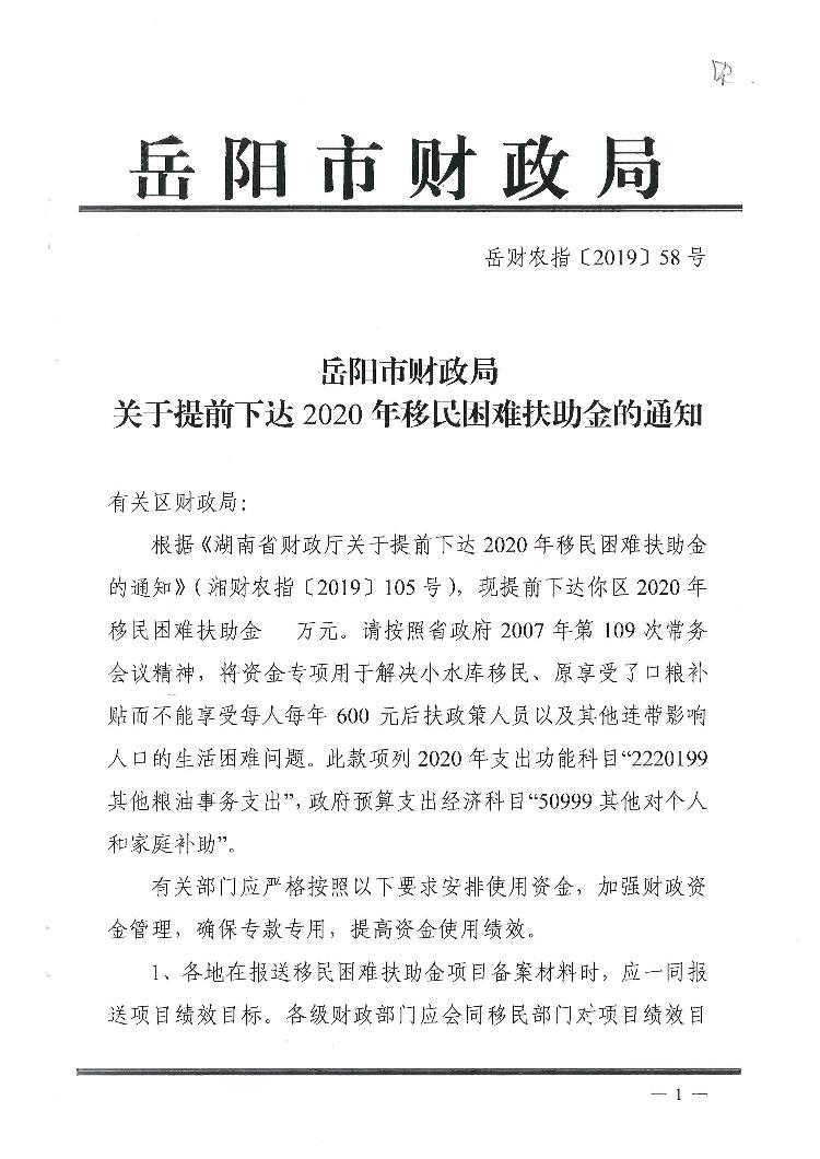 岳财农指【2019】58号提前下达2020年移民困难扶助金的通知