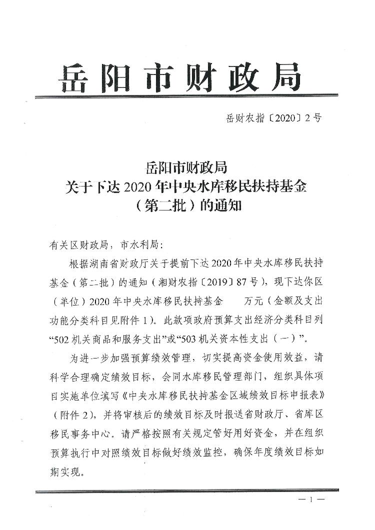 岳财农指(2020)2号2020年中央水库移民扶持基金(第二批)的通知