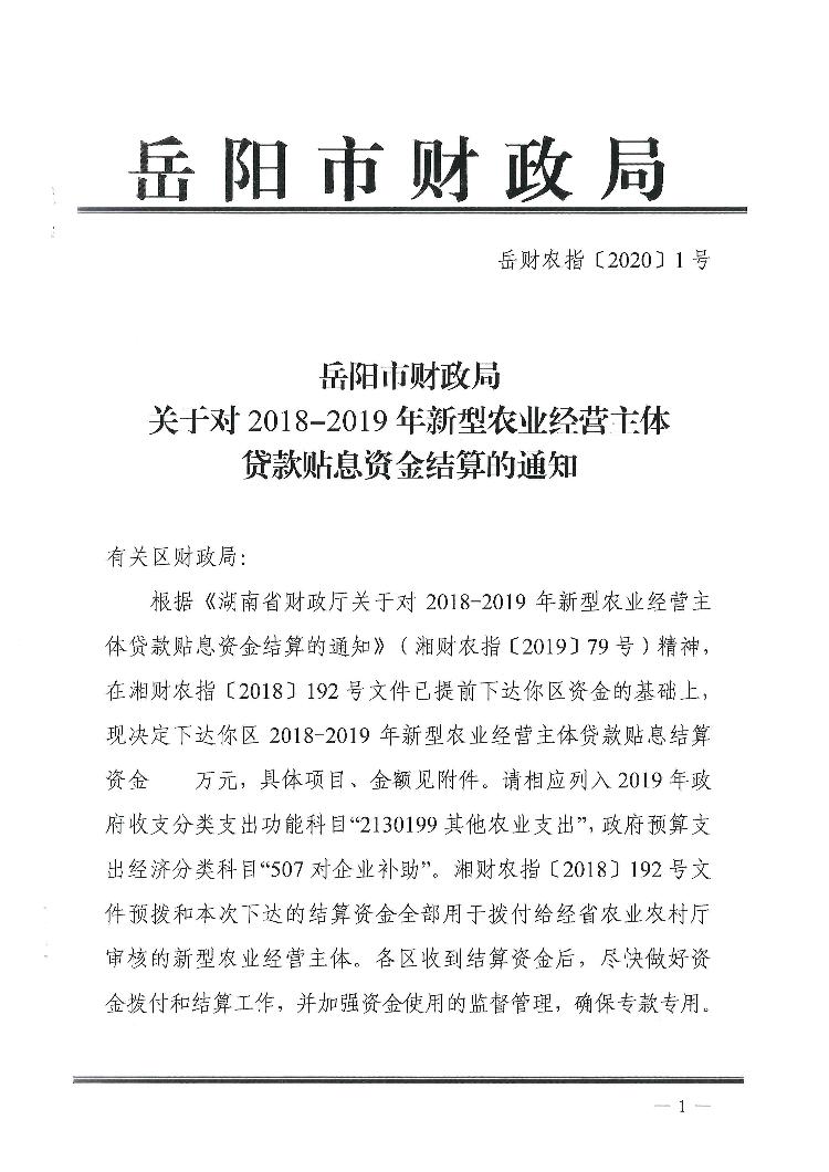 岳财农指(2020)1号2018-2019年新型农业经营主体贷款贴息资金结算的通知