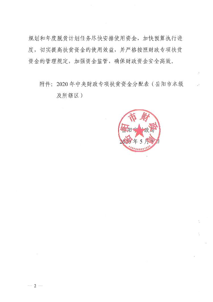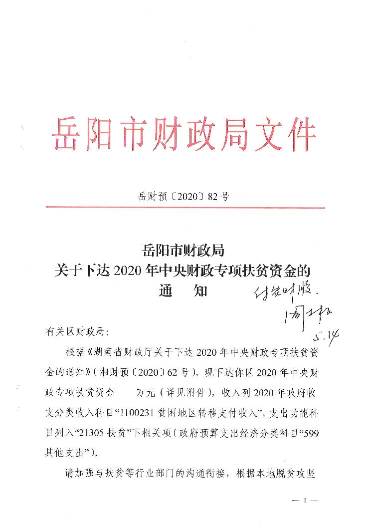 岳财预【2020】82号关于下达2020年中央财政专项扶贫资金的通知