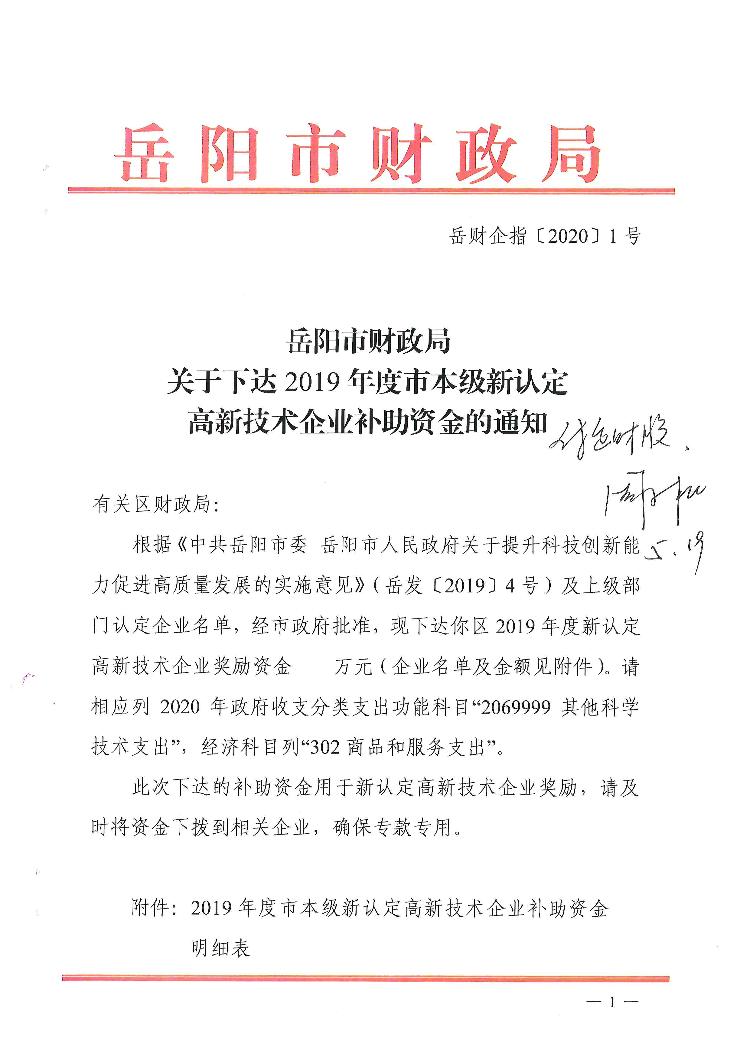 岳财企指【2020】1号关于下达2019年度市本级新认定高新技术企业补助资金的通知