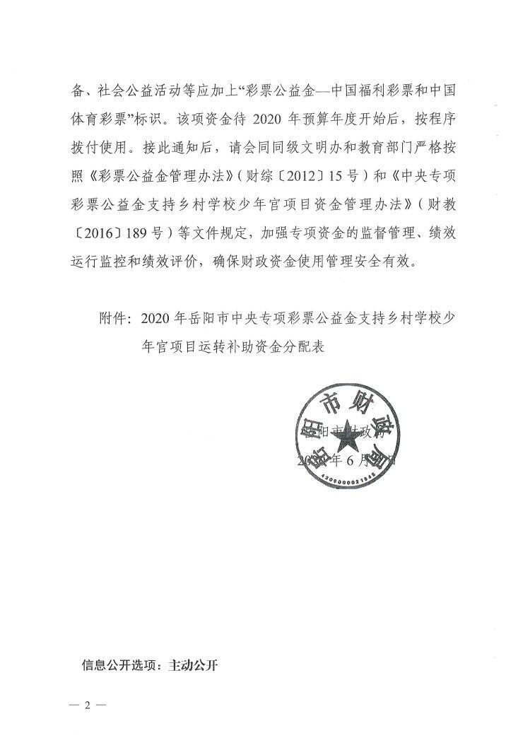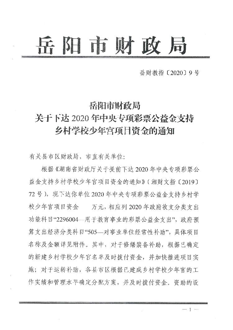 岳财教指【2020】9号下达2020年中央专项彩票公益金支持乡村学校少年宫项目资金的通知