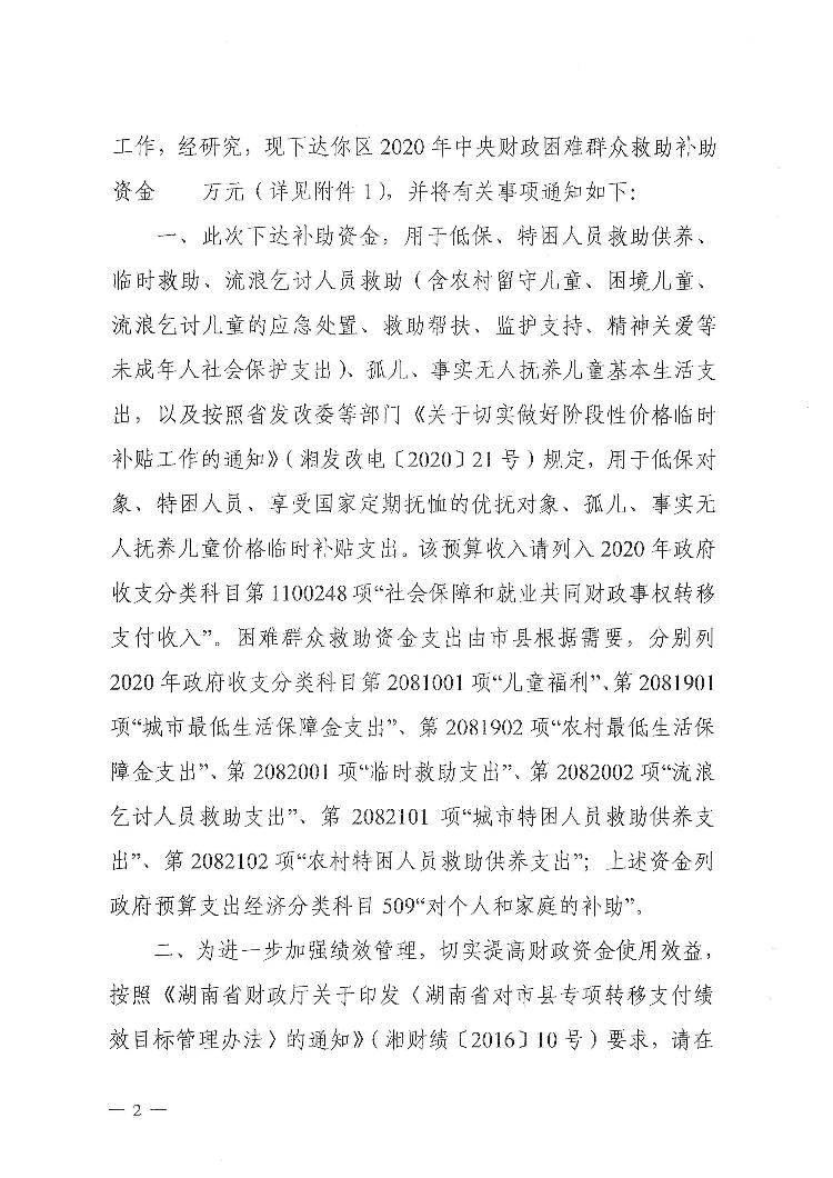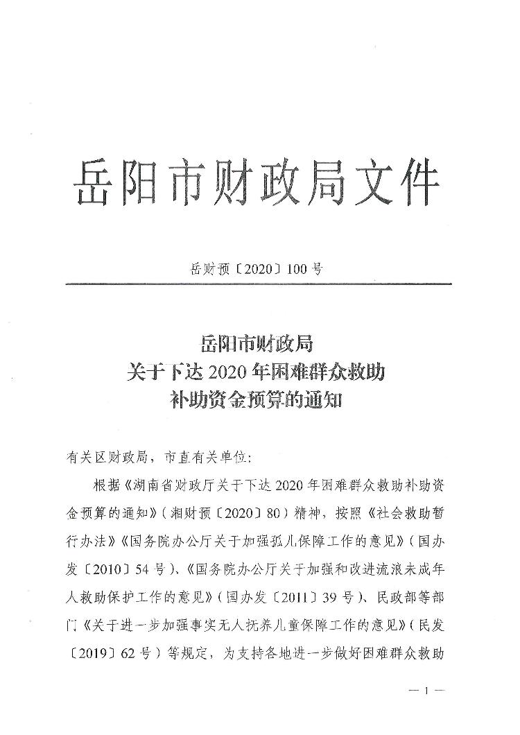 岳财预【2020】100号下达2020年困难群众救助补助资金预算的通知