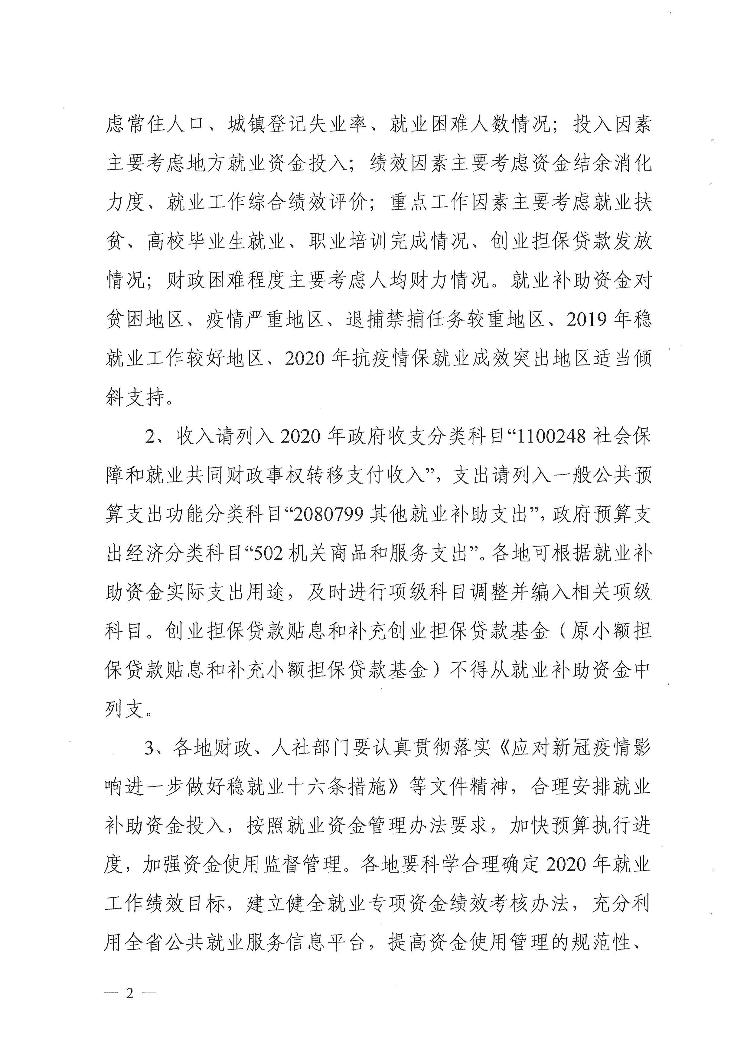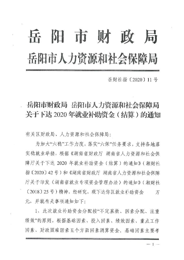岳财社指【2020】11号下达2020年就业补助资金(结算)的通知