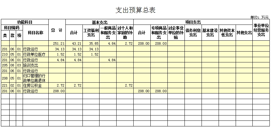 预算总支出251.21万元,其中:基本支出43.21万元(工资福利支出35.65万元、一般商品和服务支出 4.84万元、对个人和家庭的补助支出2.72万元);项目支出208万元。