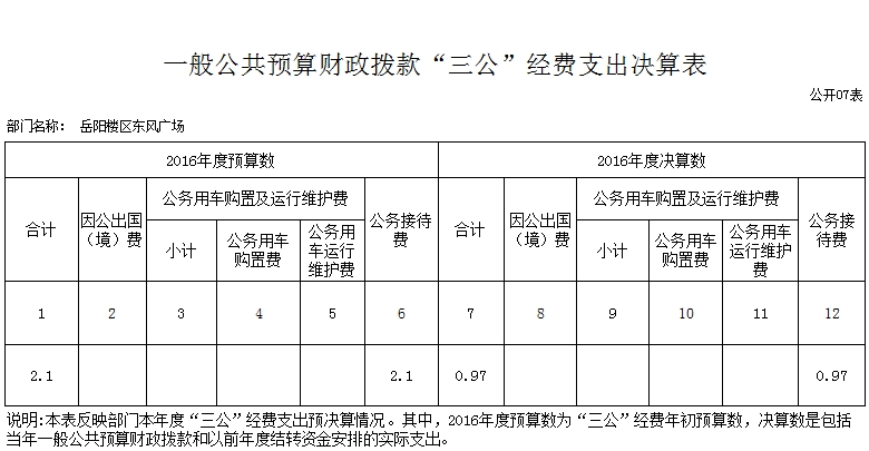 2016年“三公”经费支出合计0.97万元,比公开的部门预算数减少1.13万元,公务接待主要是东风广场搞卫生迎检工作用,共38批112人次。没有因公出国(境)和公务用车运行费用。
