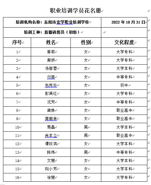 岳阳市宏学职业培训学校于2022年9月21日到2022年10月8日组织了50当地企业在职员工开展了2022年第一期(1个班)初级直播销售员培训,经考核检验,此次培训学员中43人考试合格,获得了43人培训合格证书。