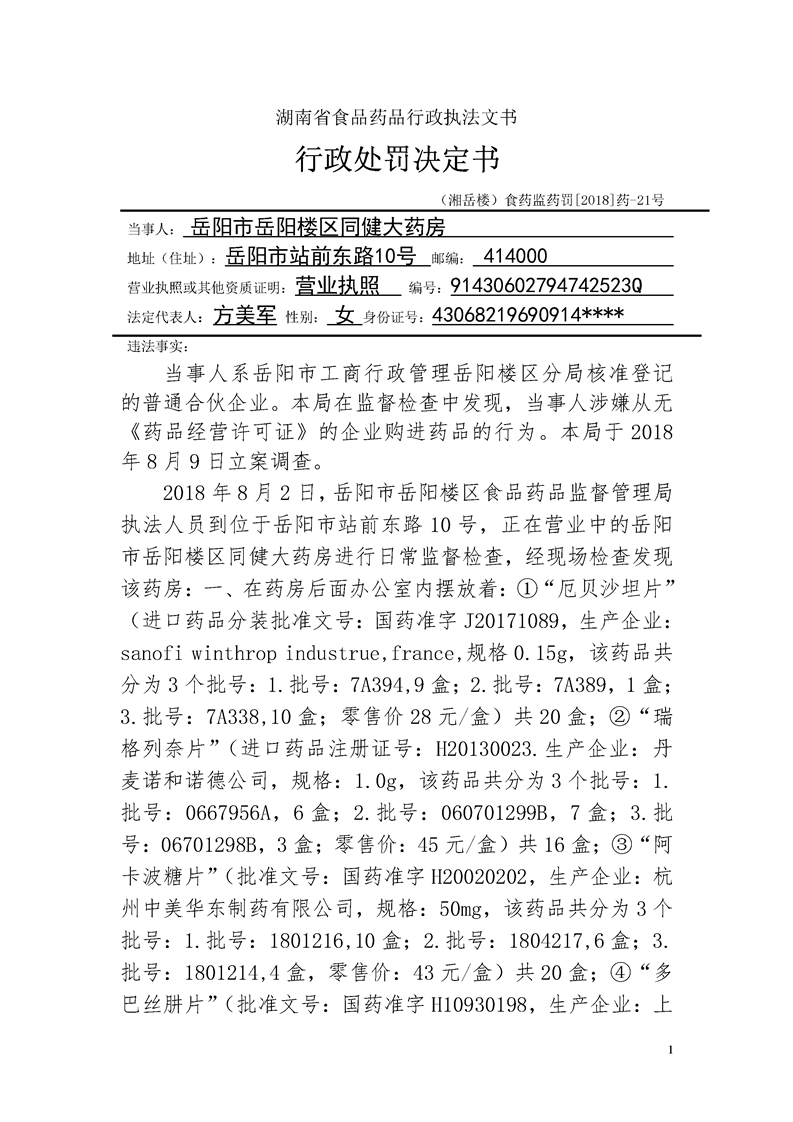 岳阳楼区食品药品监督管理局行政处罚文书公示(2018年9月第九期)