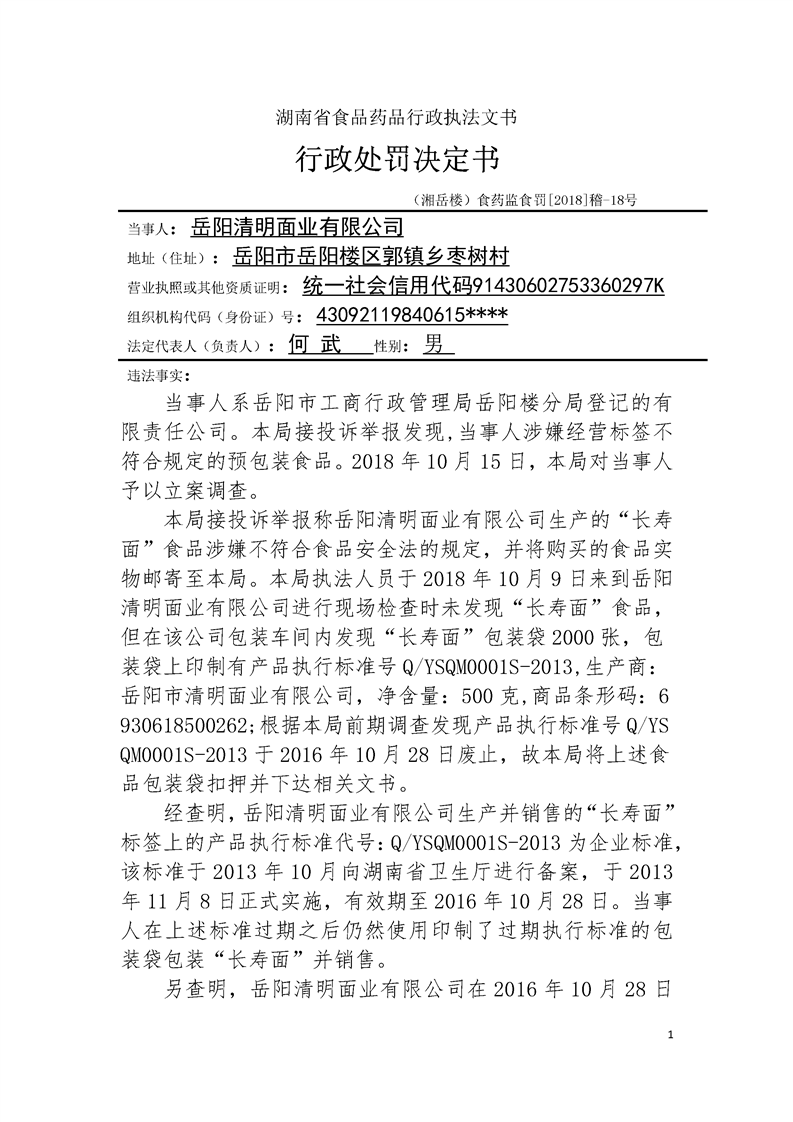 岳阳楼区食品药品监督管理局行政处罚案件文书公示(2018年十月第六期)