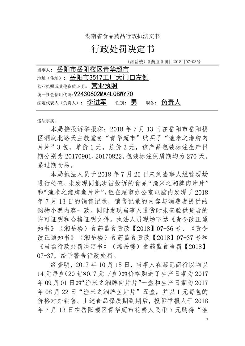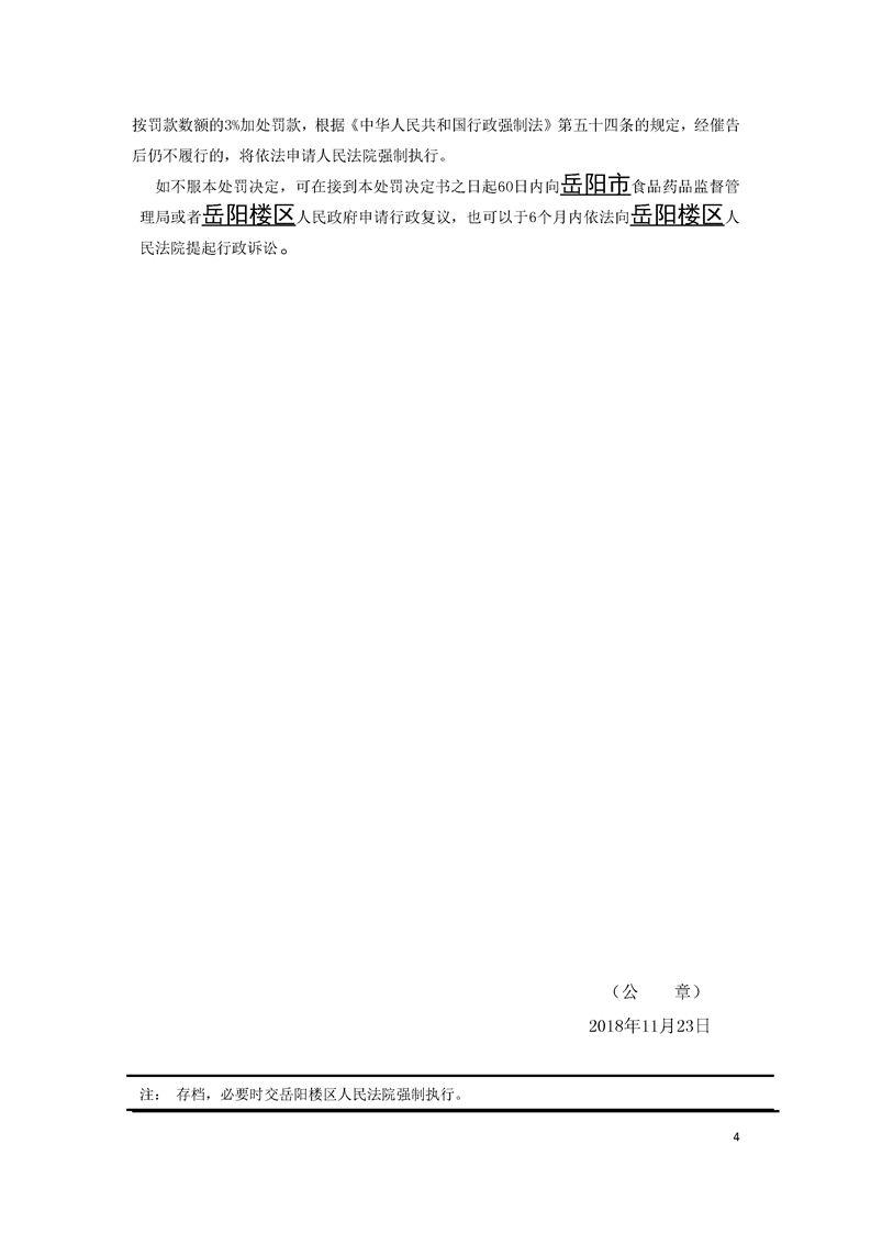 岳阳楼区食品药品监督管理局行政处罚案件文书公示(2018年十一月第十期)
