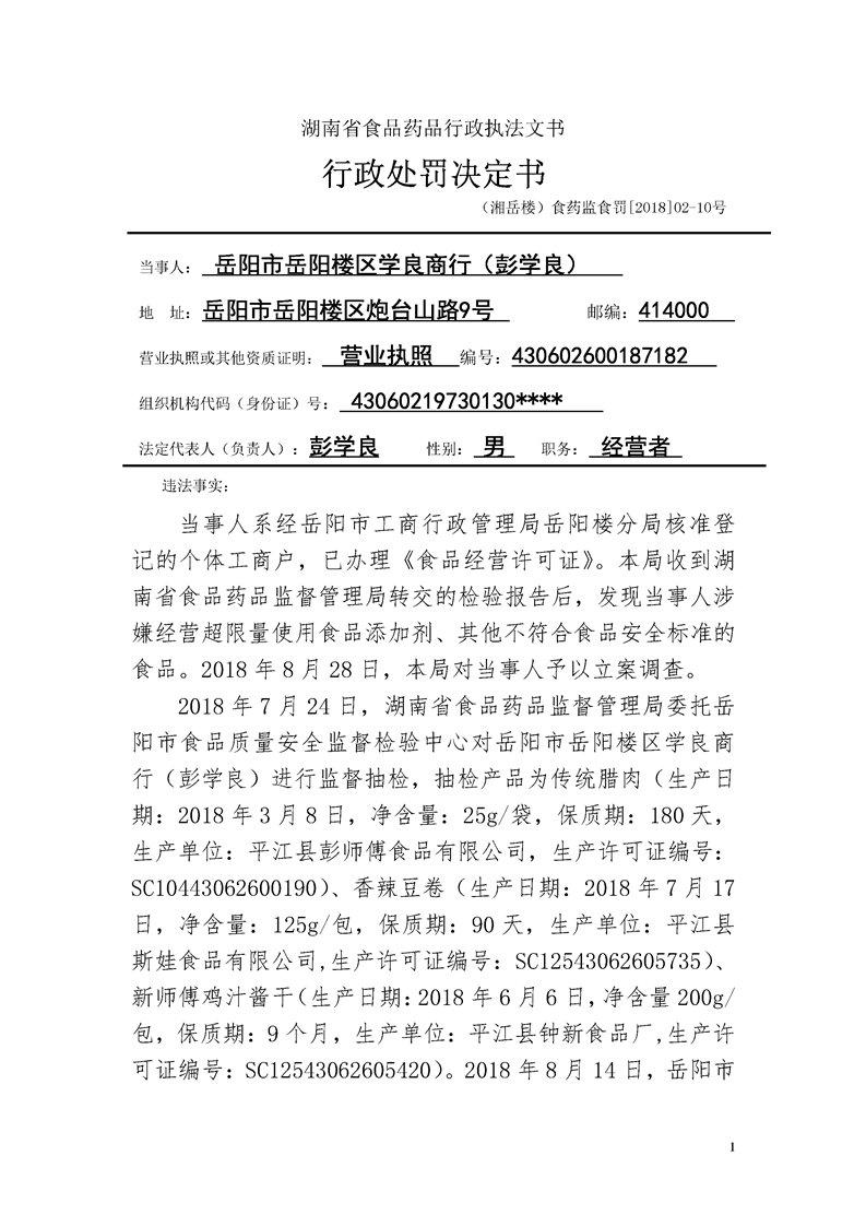 岳阳楼区食品药品监督管理局行政处罚案件文书公示(2018年十二月第五期)