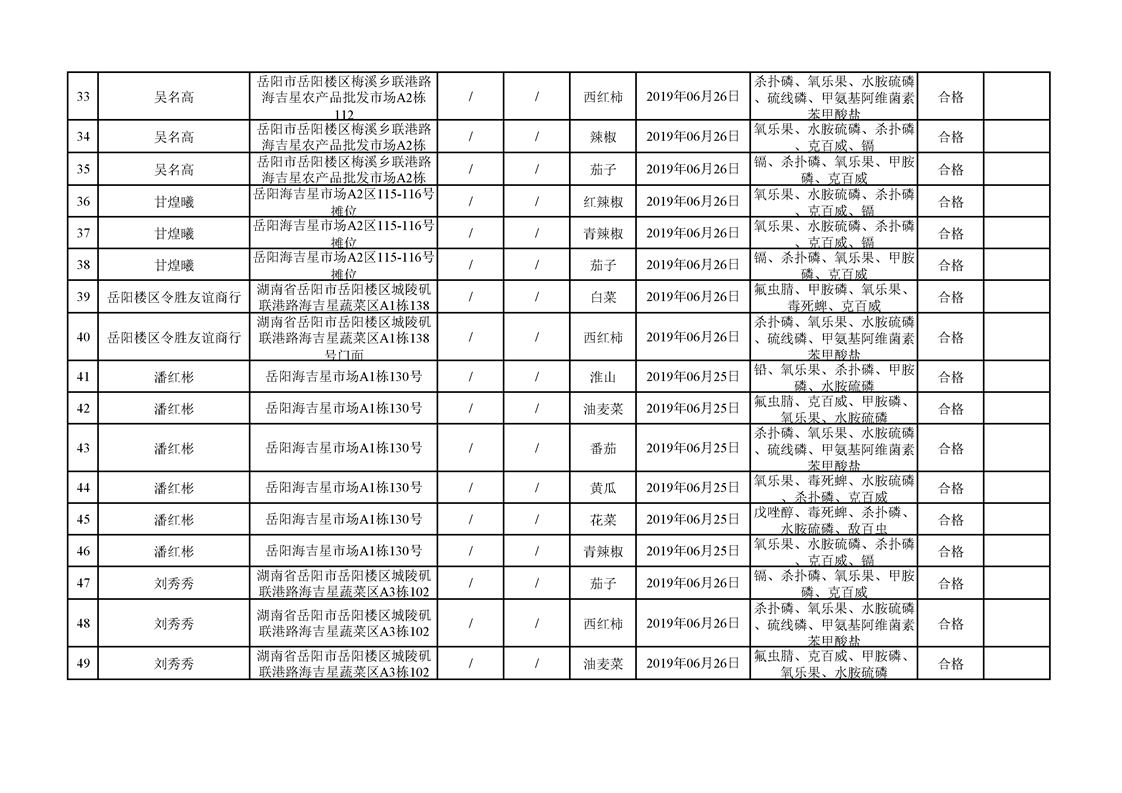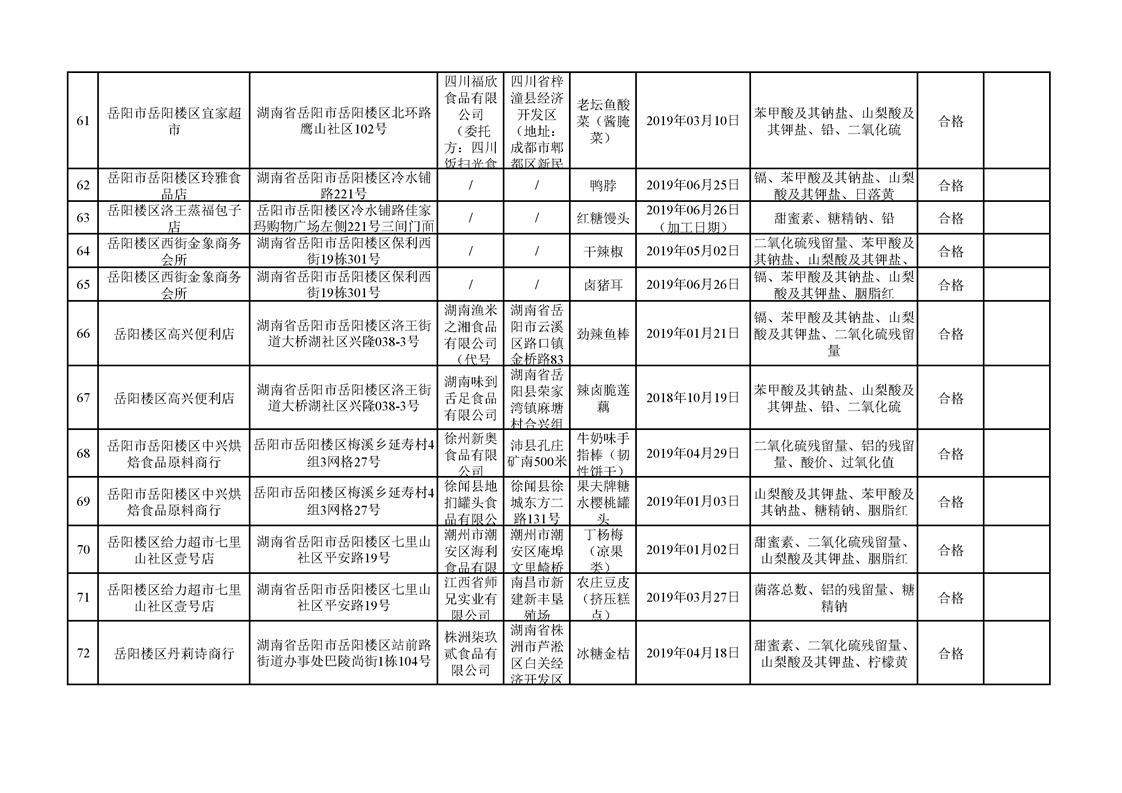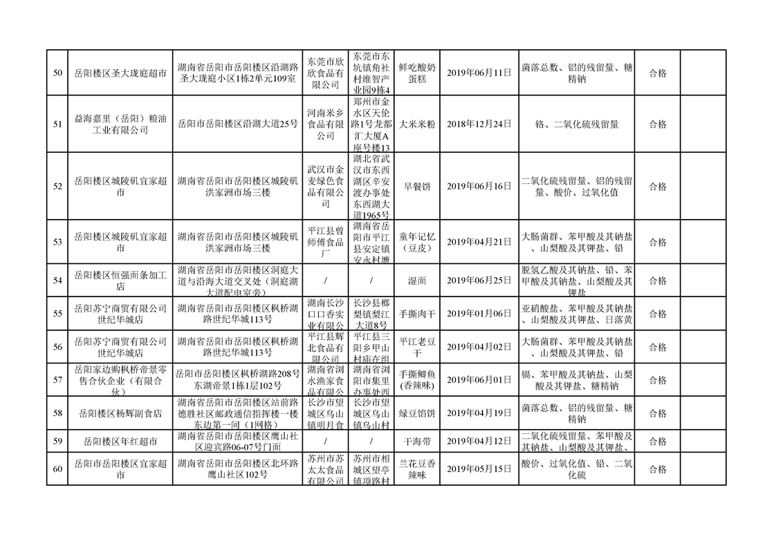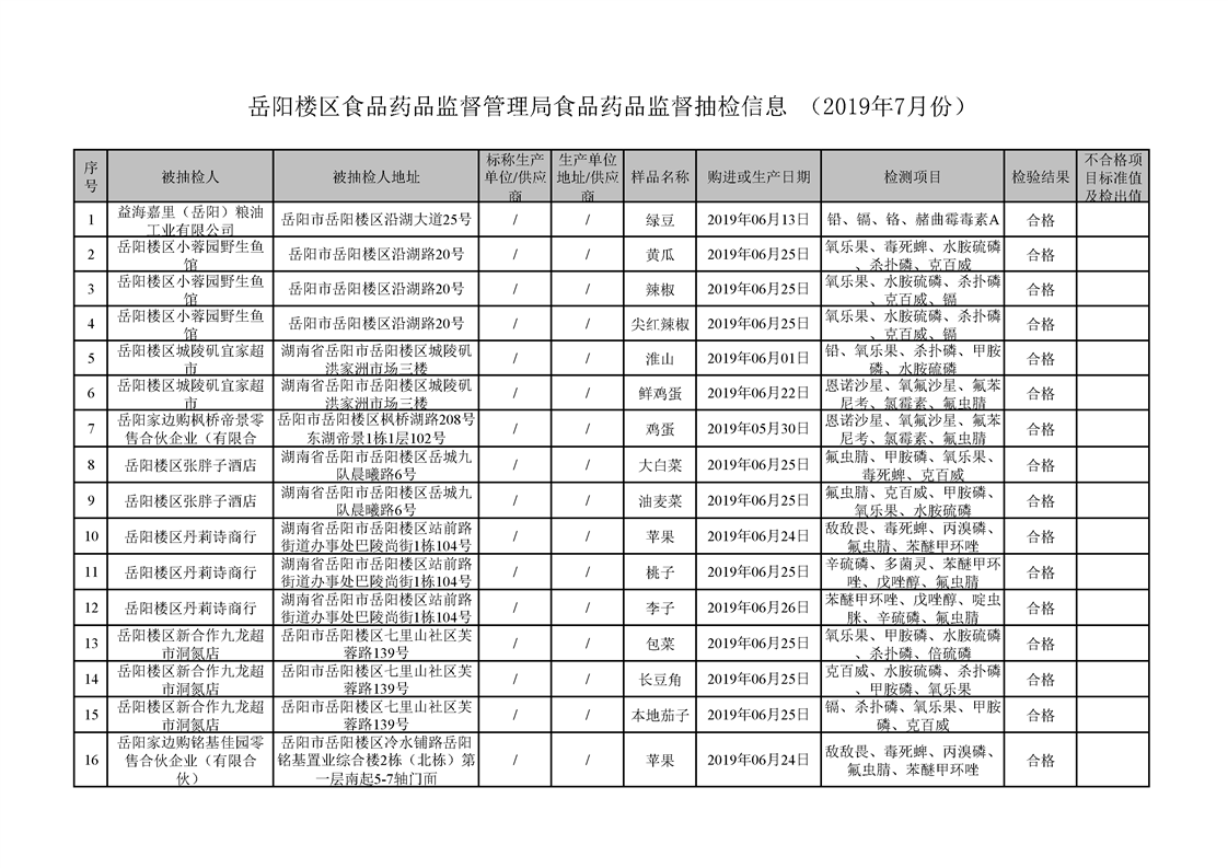 岳阳楼区食品药品监督管理局食品药品监督抽检信息(2019年7月份)