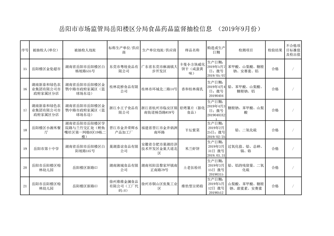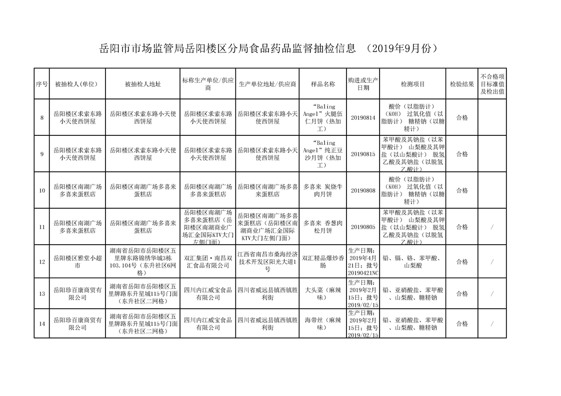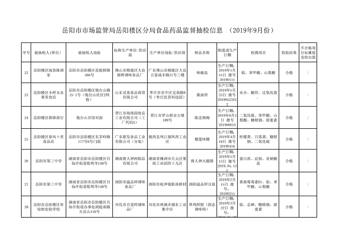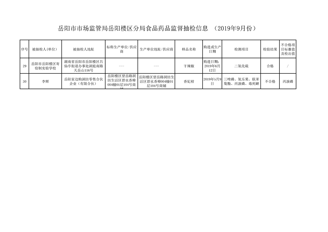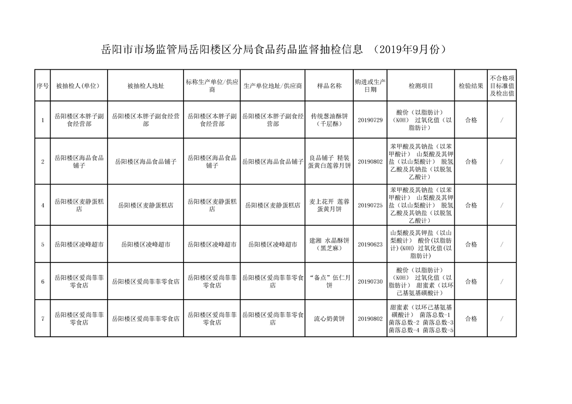 岳阳市市场监督管理局岳阳楼区分局食品药品监督抽检信息(2019年9月份)