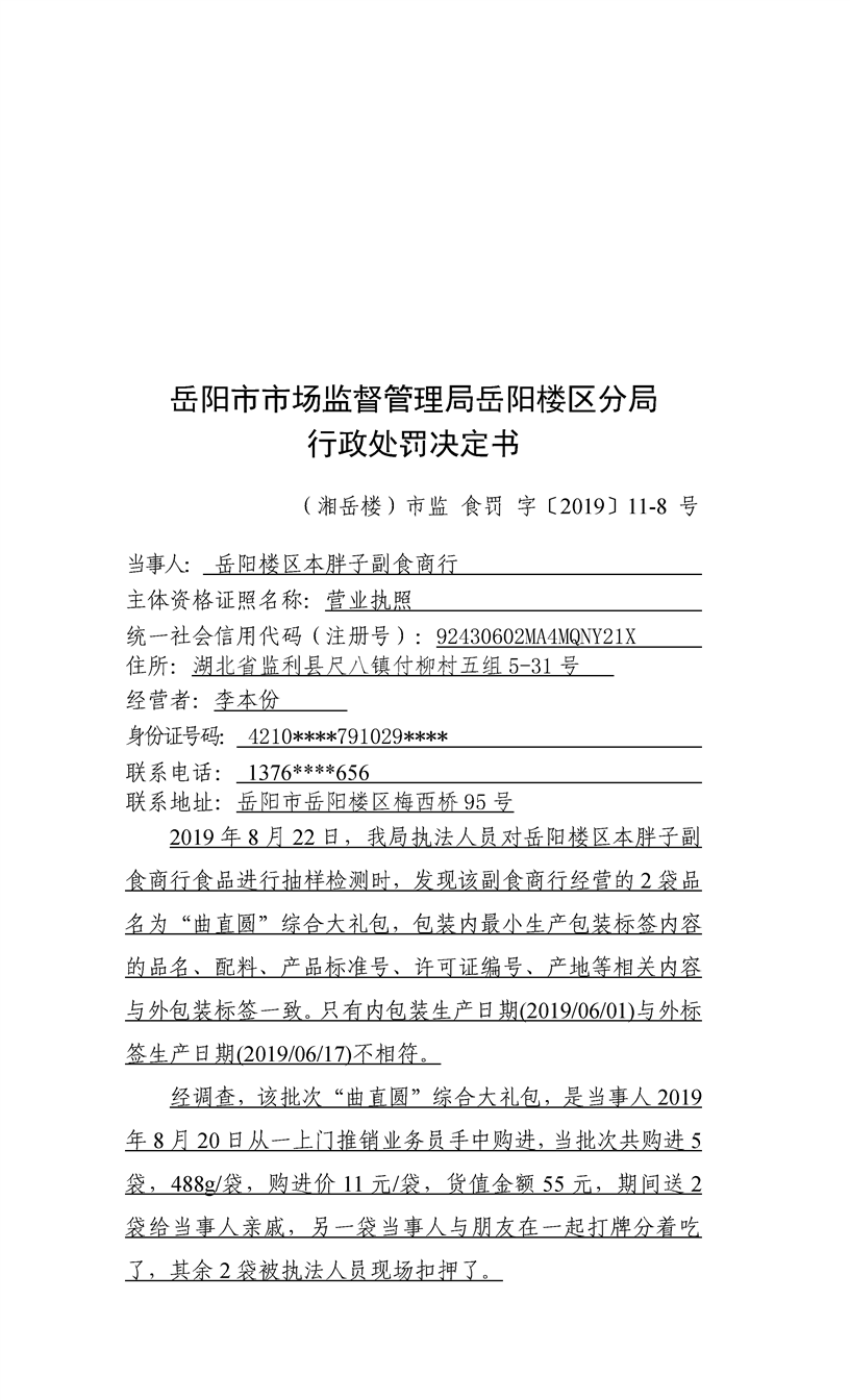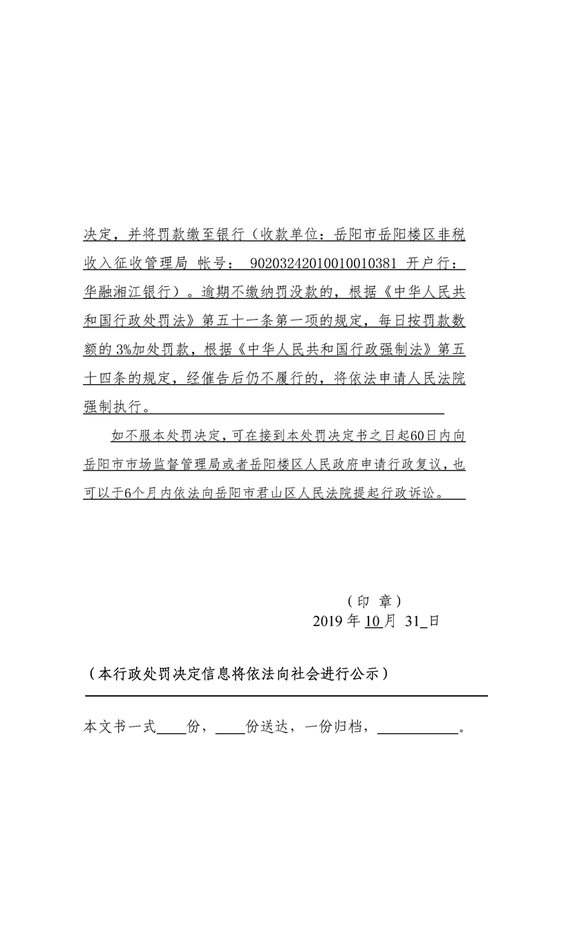岳阳市市场监督管理局岳阳楼区分局行政处罚文书公示(2019年11月份第一期)