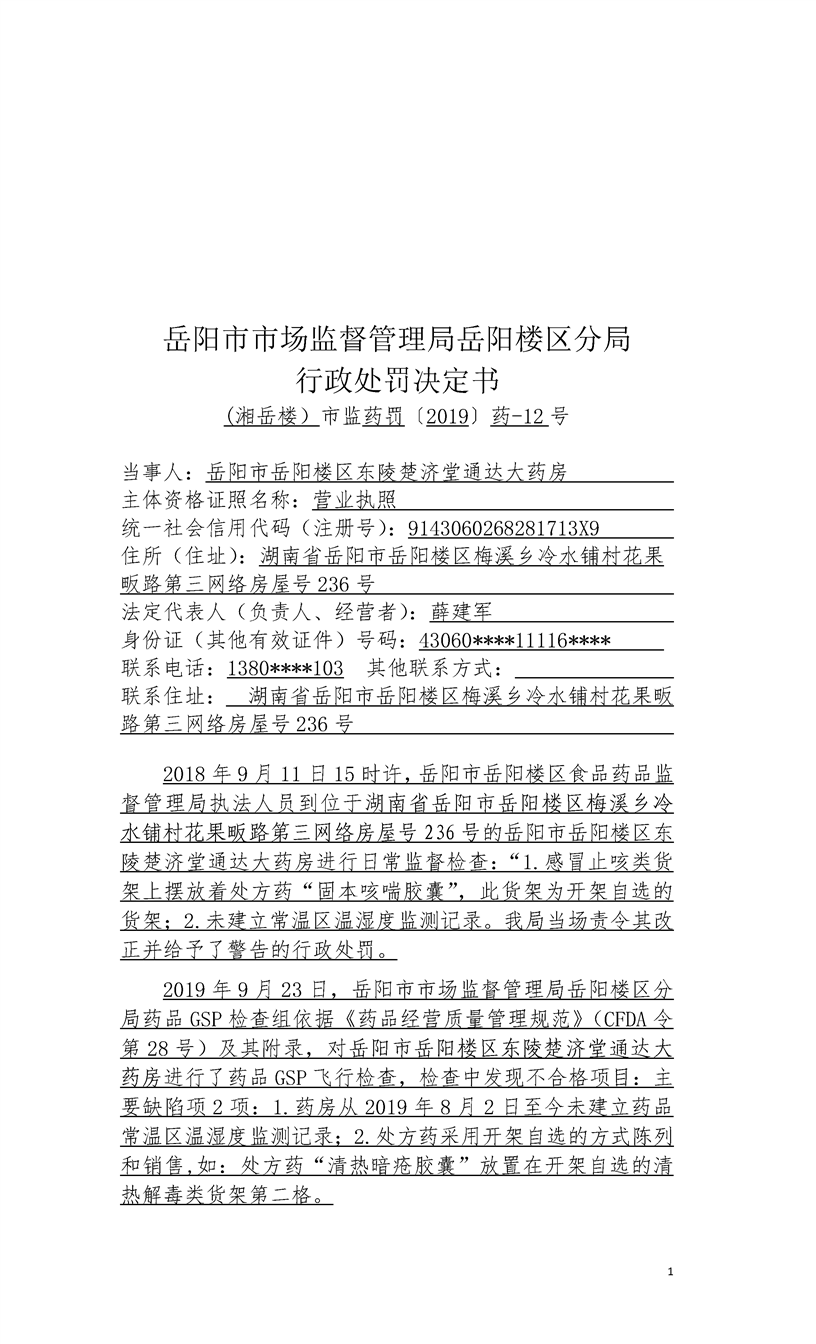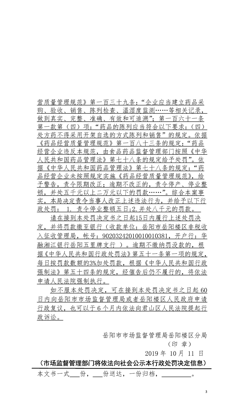 岳阳市市场监督管理局岳阳楼区分局行政处罚文书公示(2019年11月份第三期)