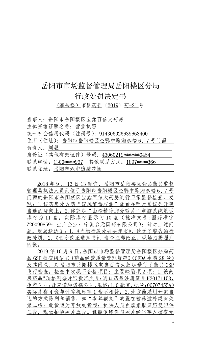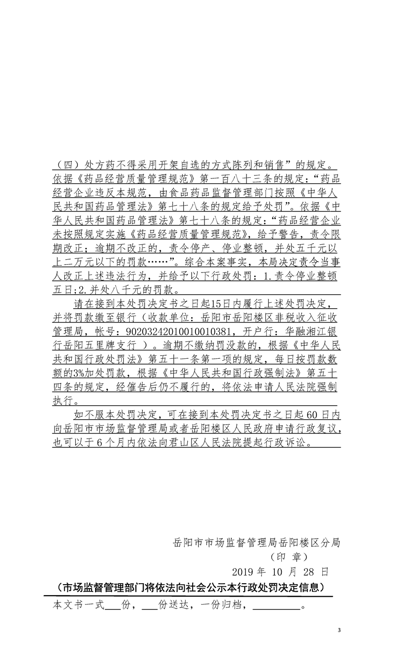 岳阳市市场监督管理局岳阳楼区分局行政处罚文书公示(2019年11月份第十九期)