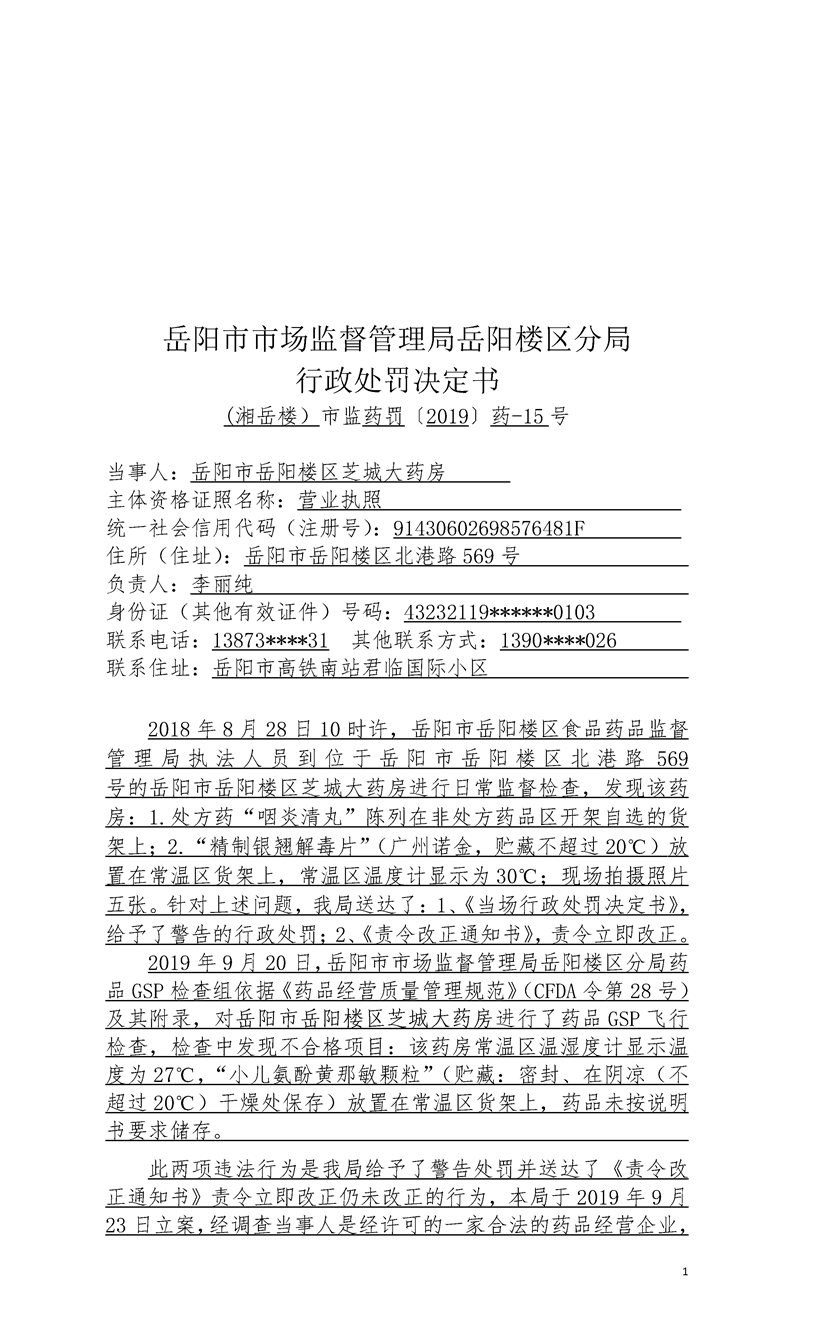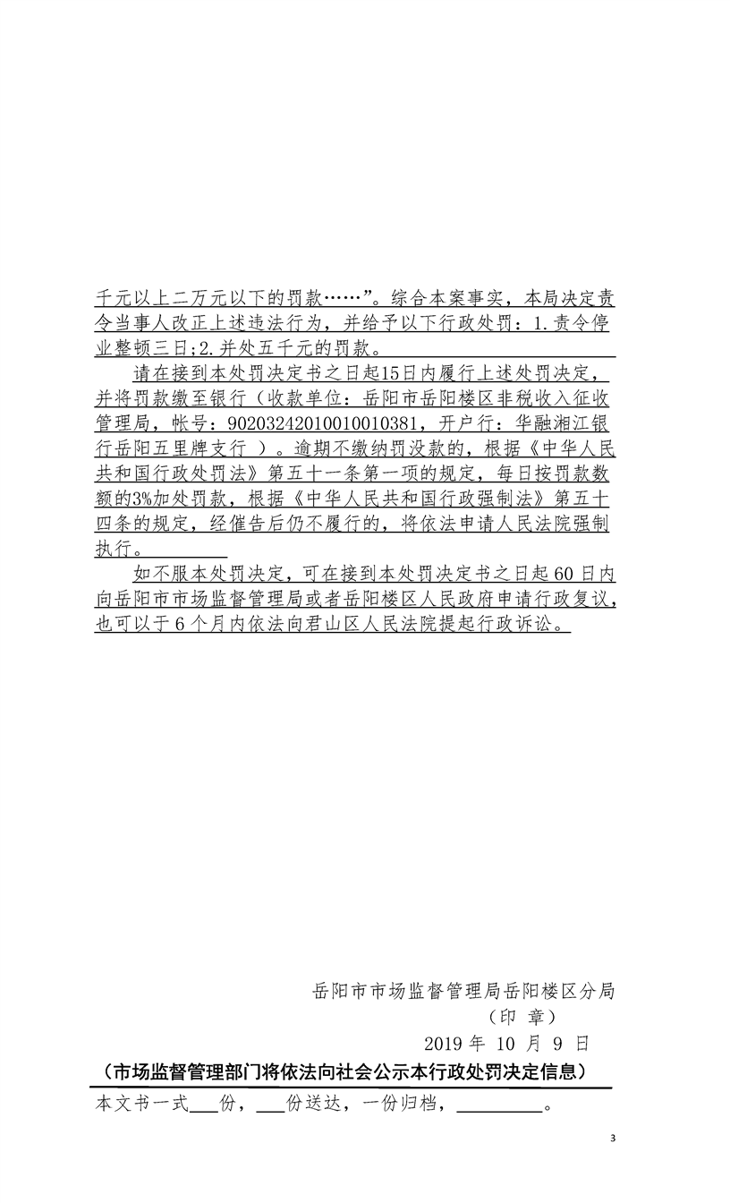 岳阳市市场监督管理局岳阳楼区分局行政处罚文书公示(2019年11月份第二十三期)