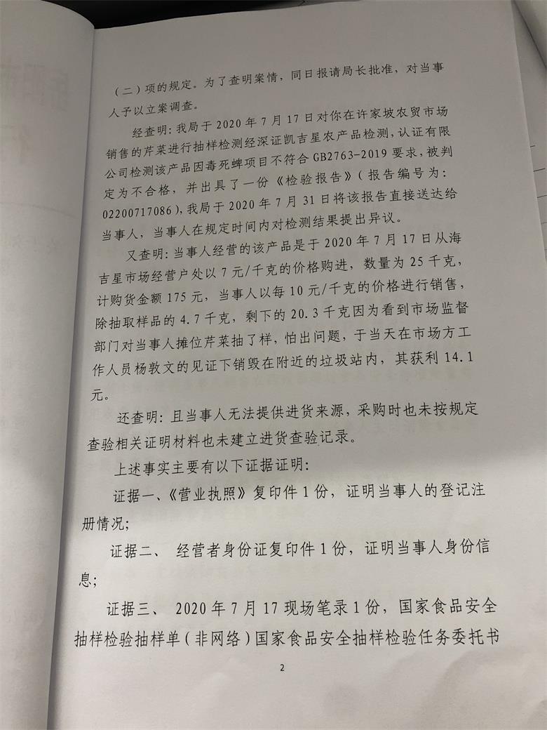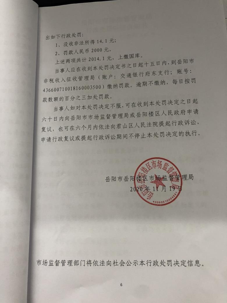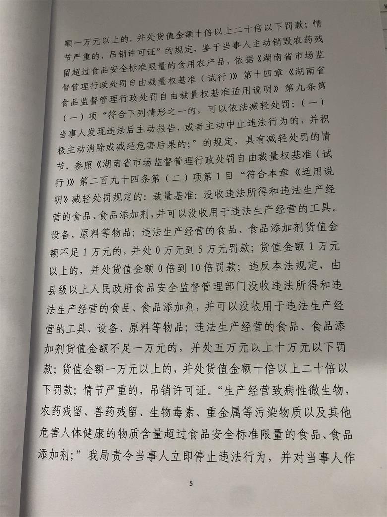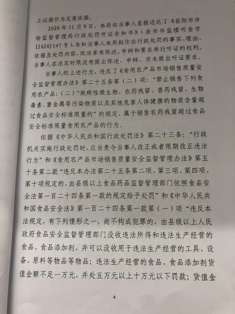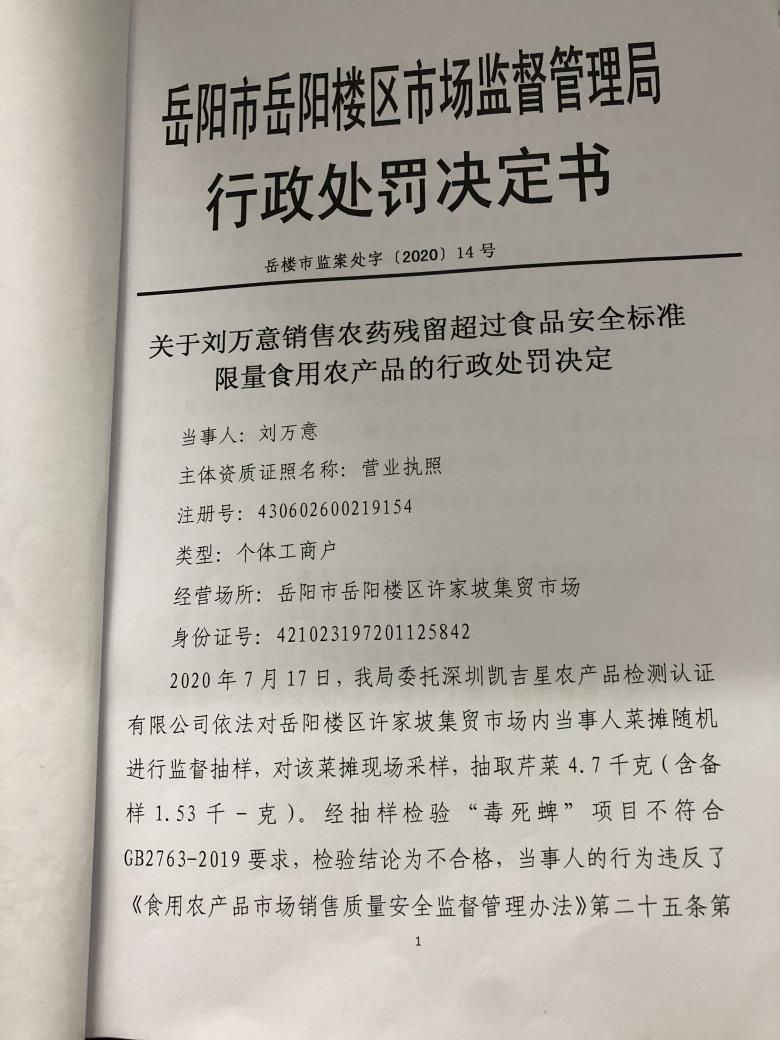 岳阳楼区市场监督管理局行政处罚文书公示(刘万意销售的食用农产品)