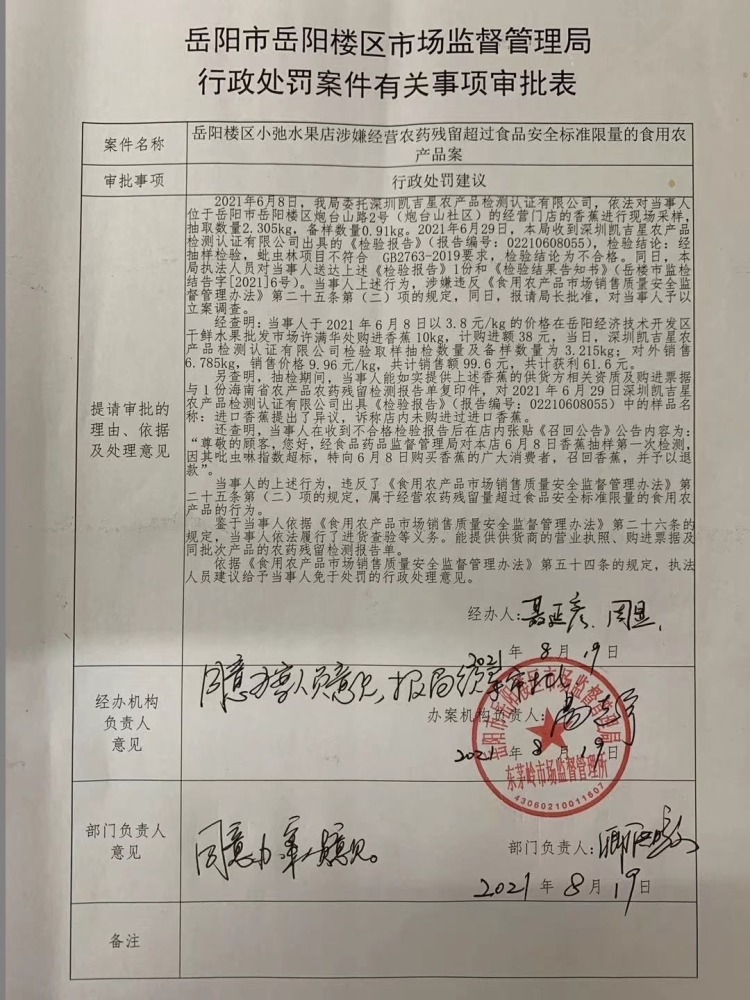 岳阳市岳阳楼区市场监管局关于小驰水果店抽检不合格食品(香蕉)核查处置信息公示