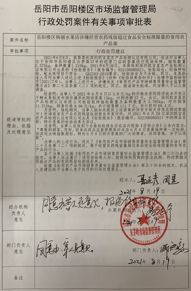 岳阳市岳阳楼区市场监管局关于杨丽水果店抽检不合格食品(香蕉)核查处置信息公示